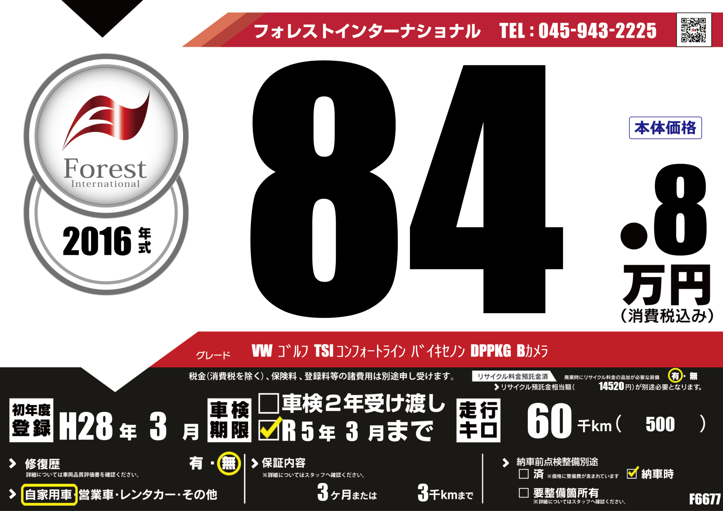 | 走行キロ | 6万km | 初年度登録 | H28年3月 |