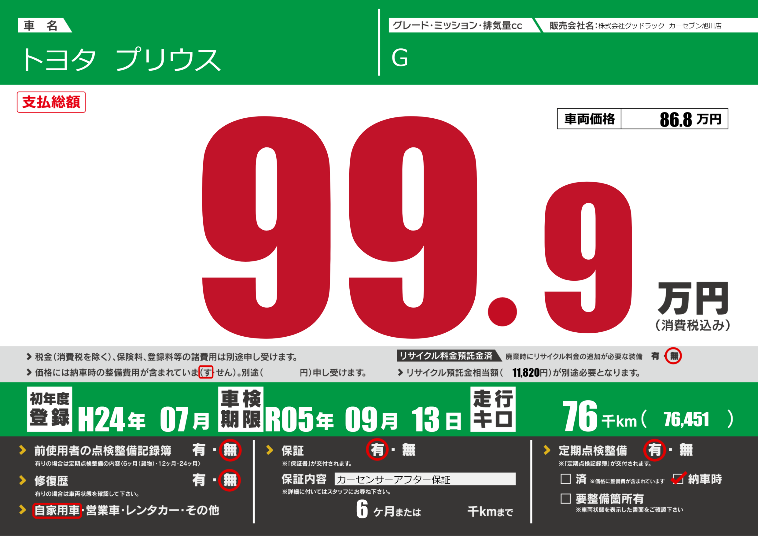 | 車名 | トヨタ プリウス | グレード ミッション 排気量 |