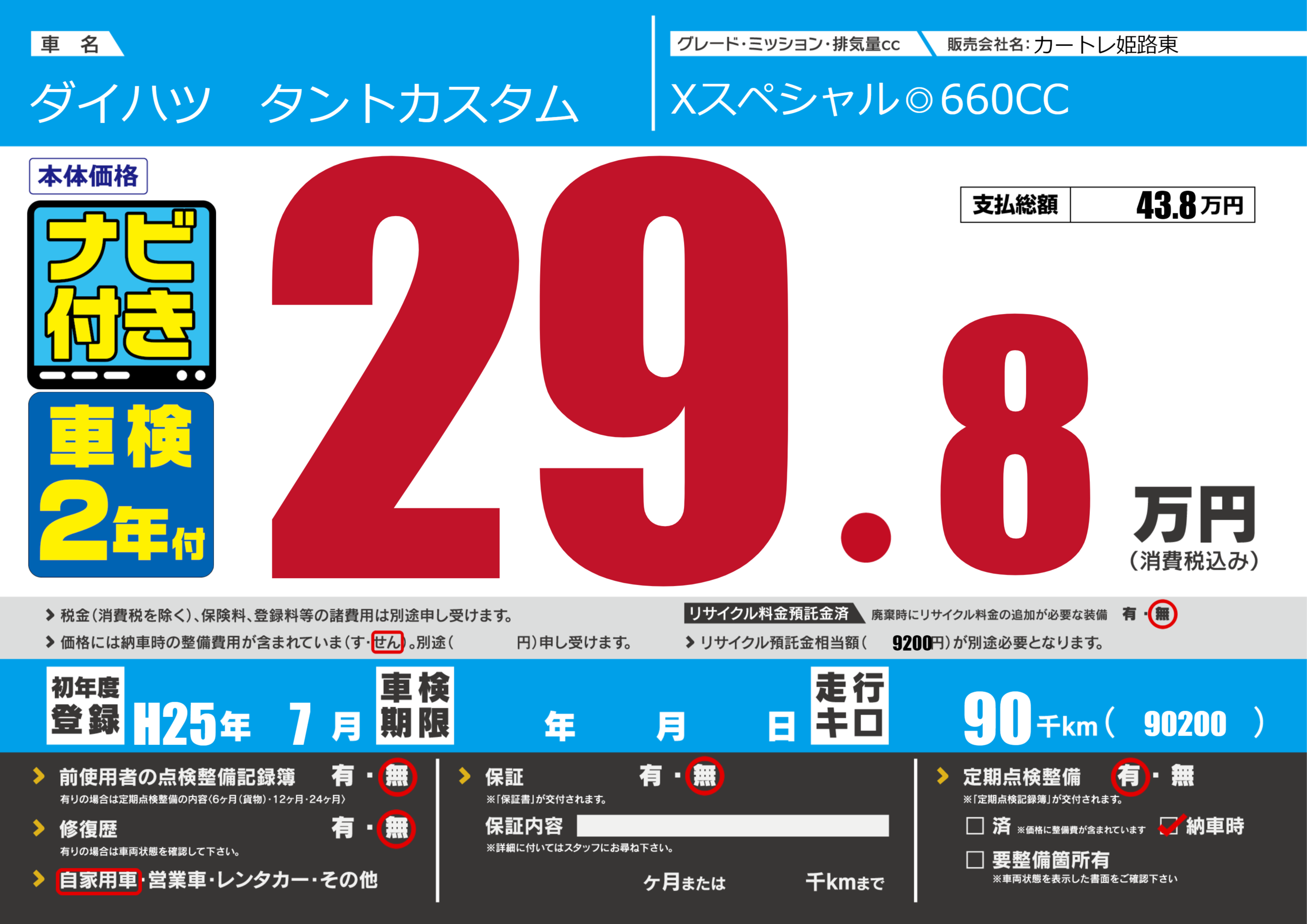 | 走行キロ | 9万km | 初年度登録 | H25年7月 |