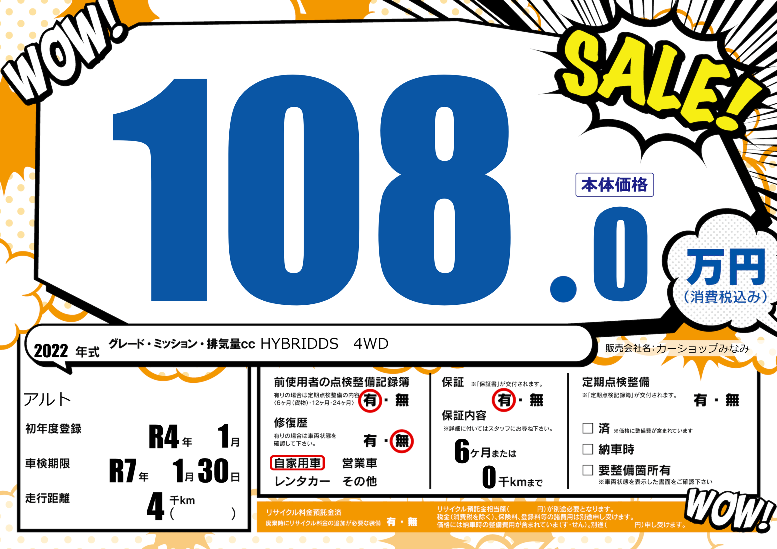 | 走行キロ | 0.4万km | 初年度登録 | R4年1月 |