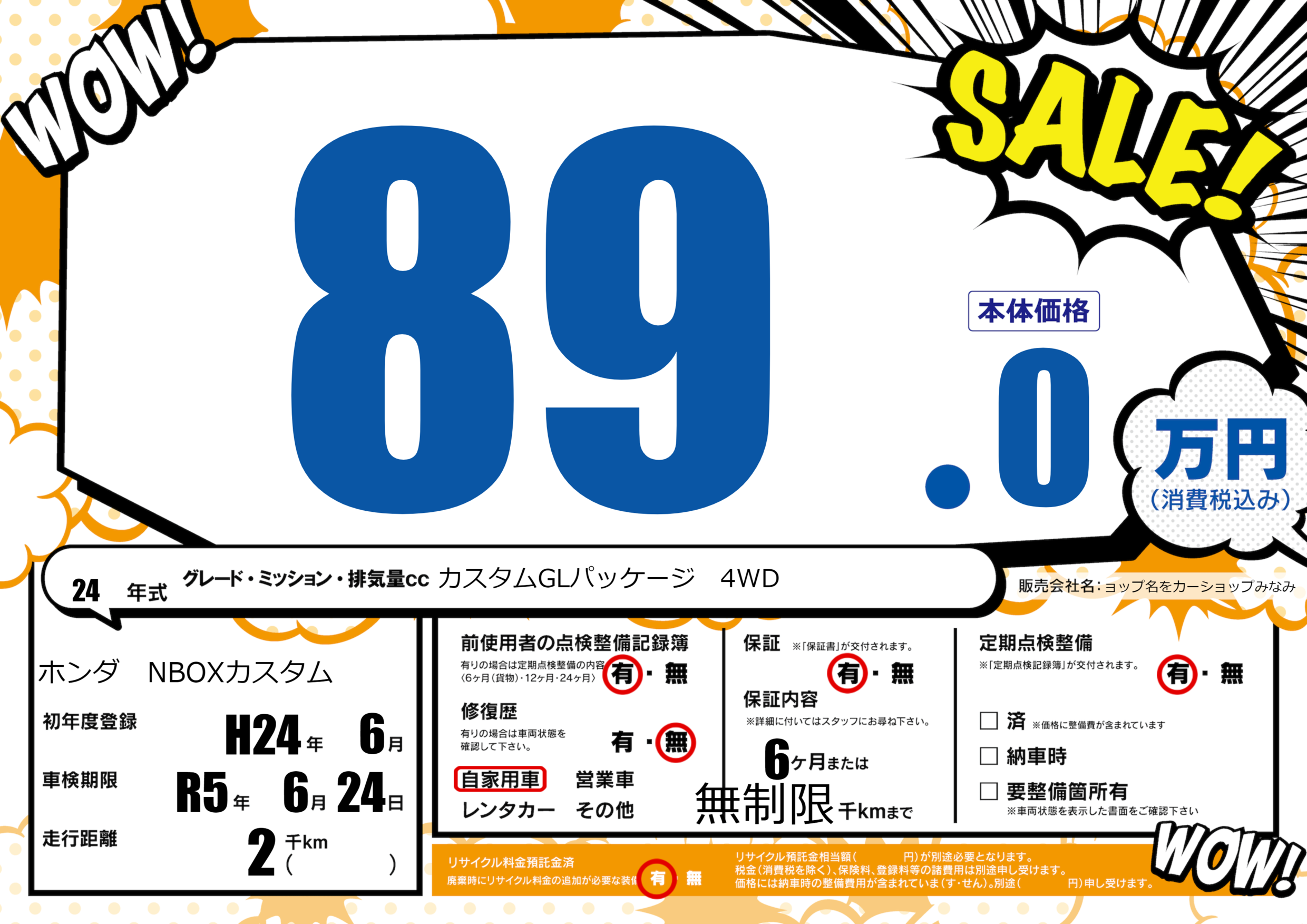 | 車名 | ホンダ NBOXカスタム | グレード ミッション 排気量 |