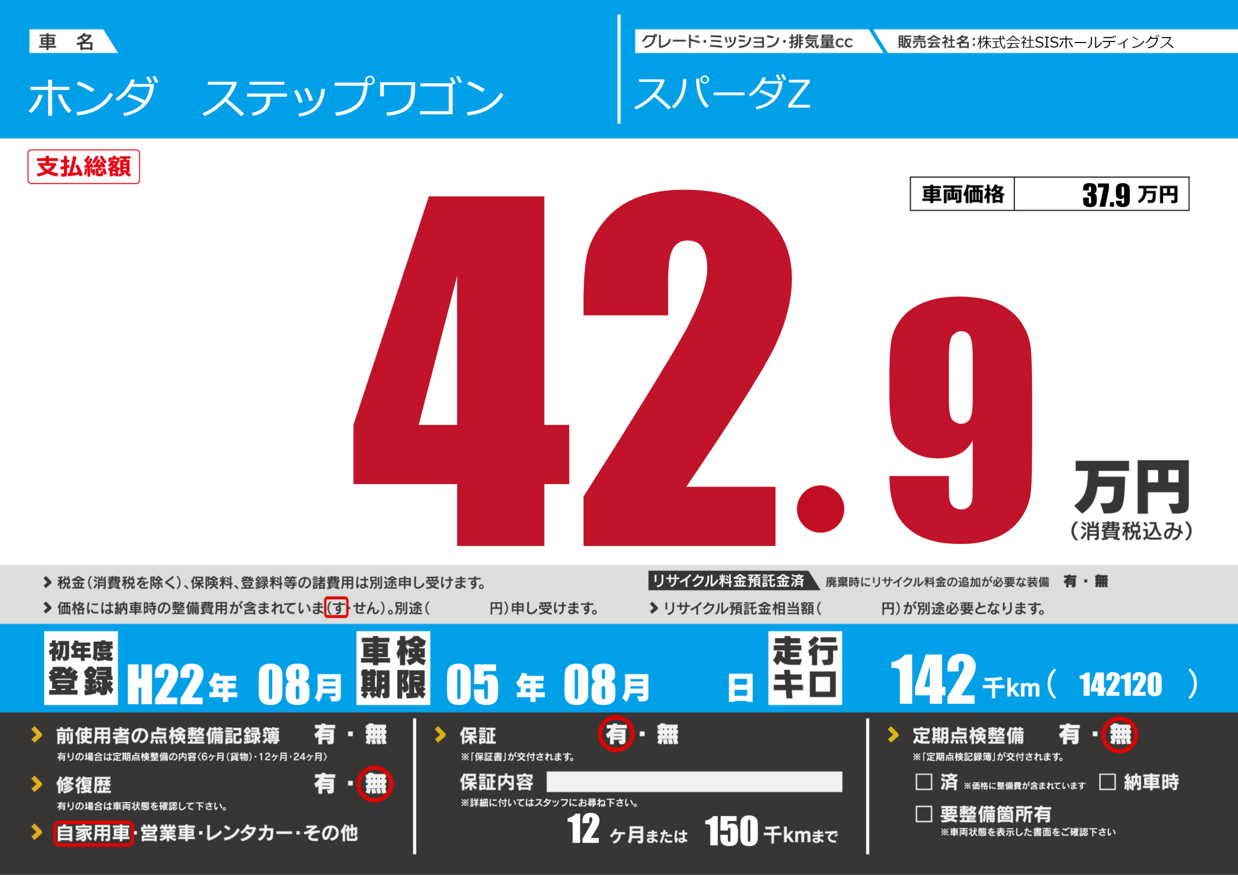 保証付き 保証内容(---) 12ヶ月または(150)千kmまで |
