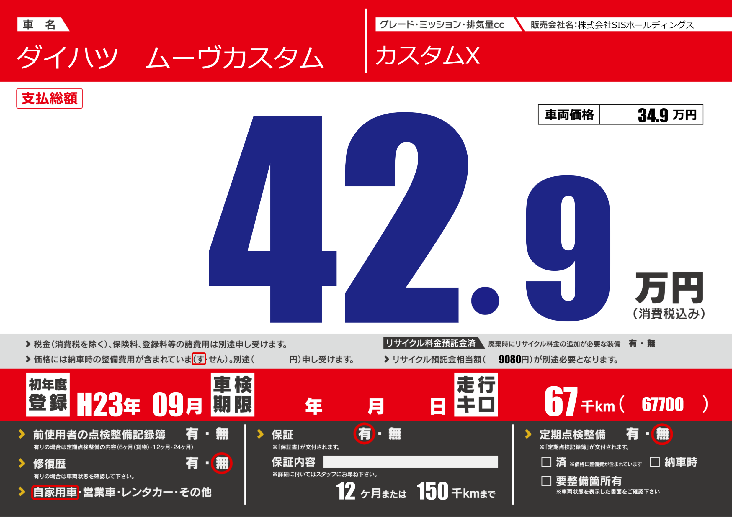 | 走行キロ | 6.7万km | 初年度登録 | H23年09月 |