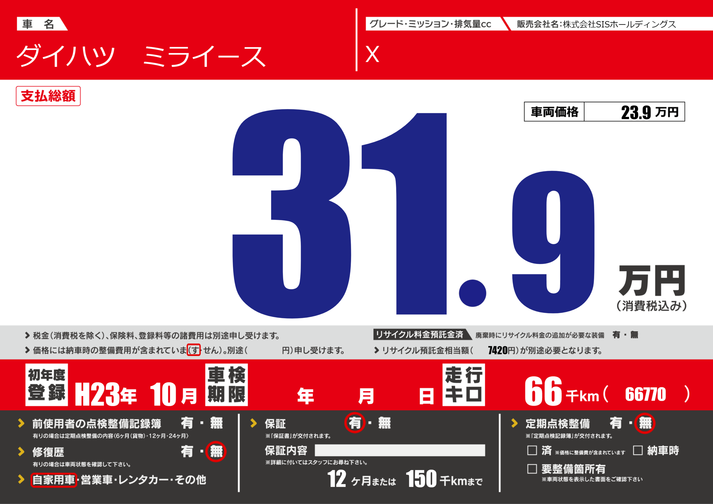 | 走行キロ | 6.6万km | 初年度登録 | H23年10月 |