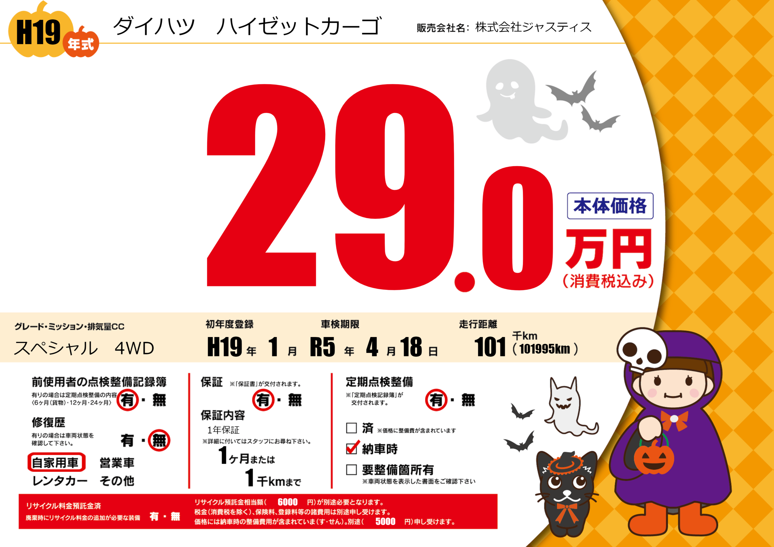 | 車名 | ダイハツ ハイゼットカーゴ | グレード ミッション 排気量 |