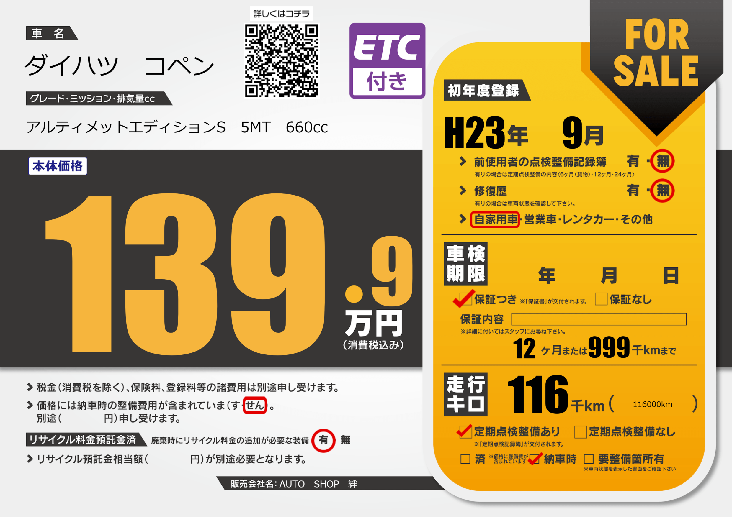 | 車名 | ダイハツ コペン | グレード ミッション 排気量 |