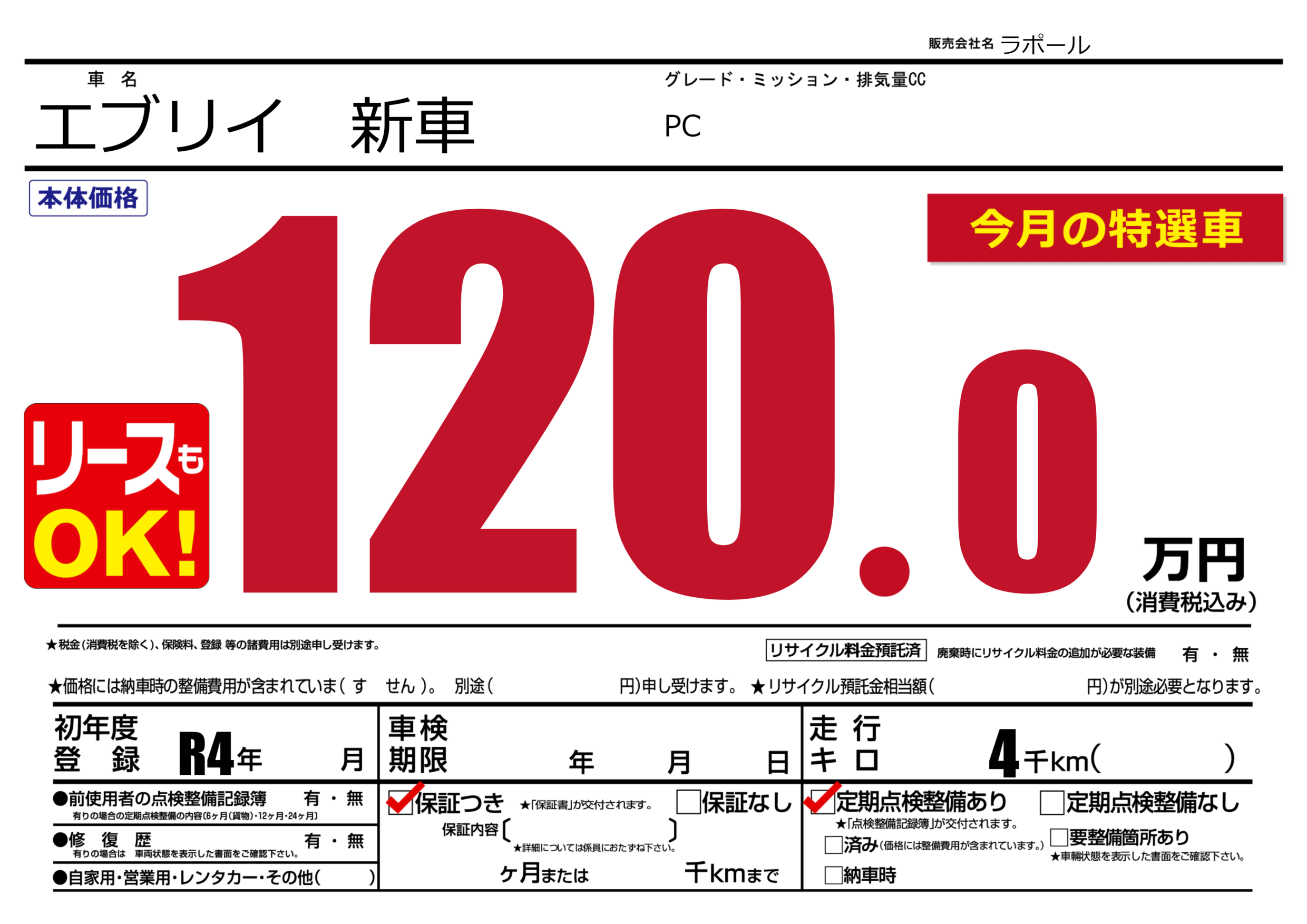 | 車名 | エブリイ 新車 | グレード ミッション 排気量 |