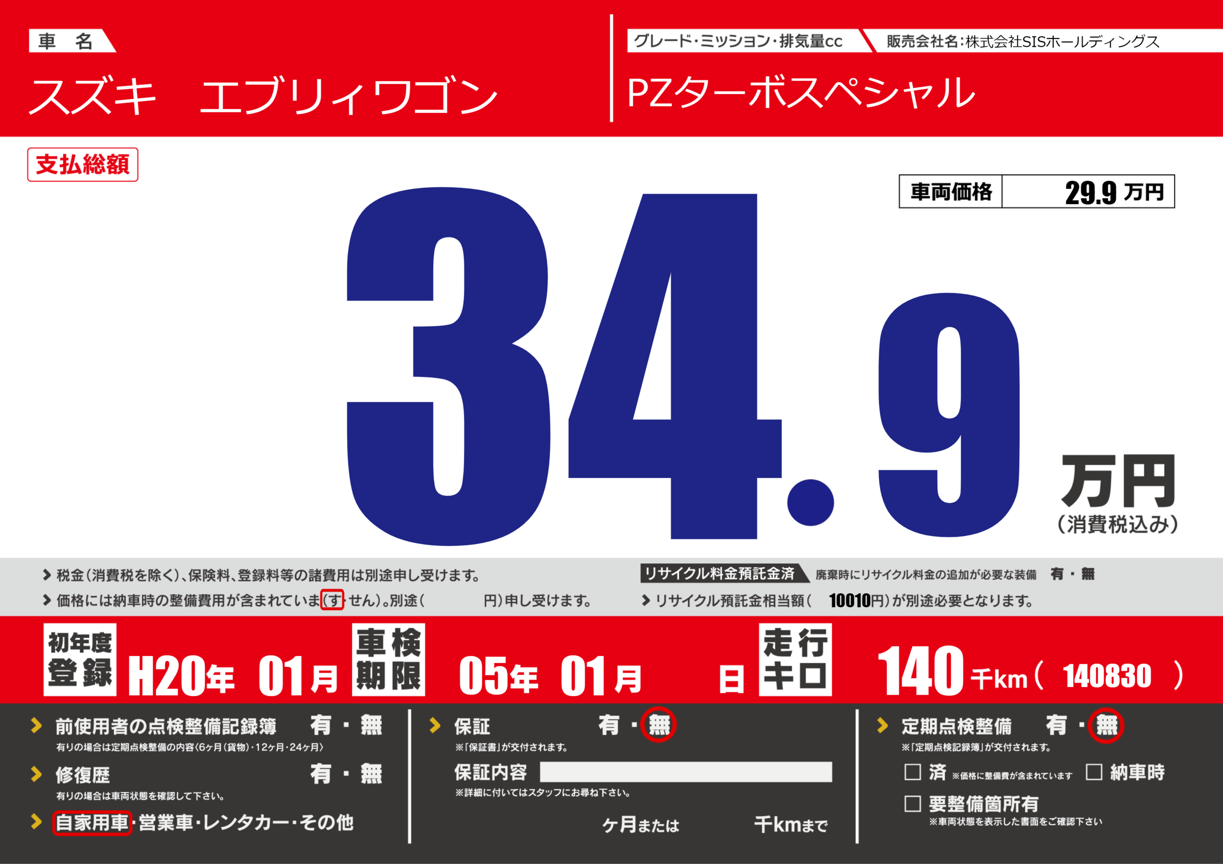 | 車名 | スズキ エブリィワゴン | グレード ミッション 排気量 |