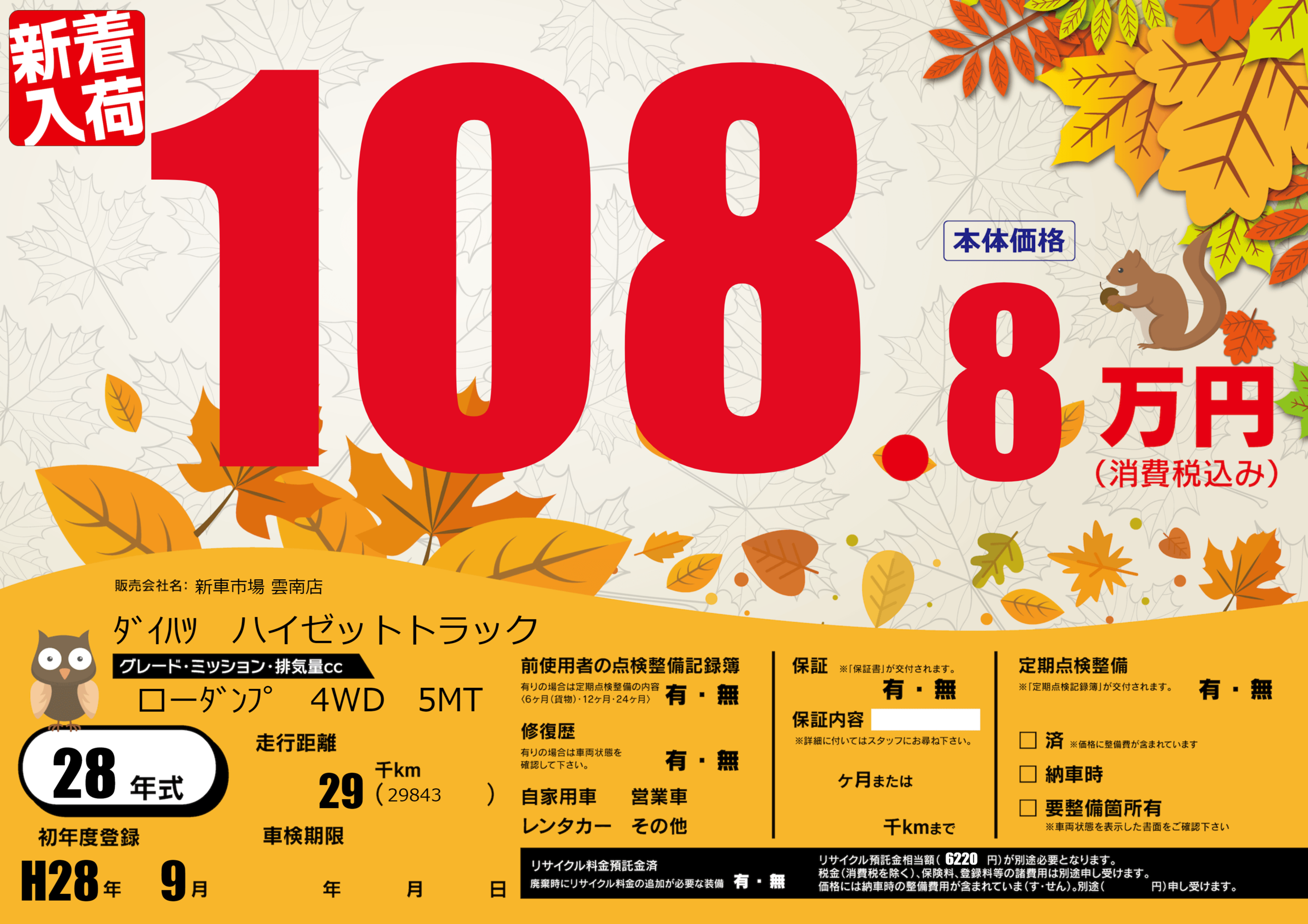 | 走行キロ | 2.9万km | 初年度登録 | H28年9月 |