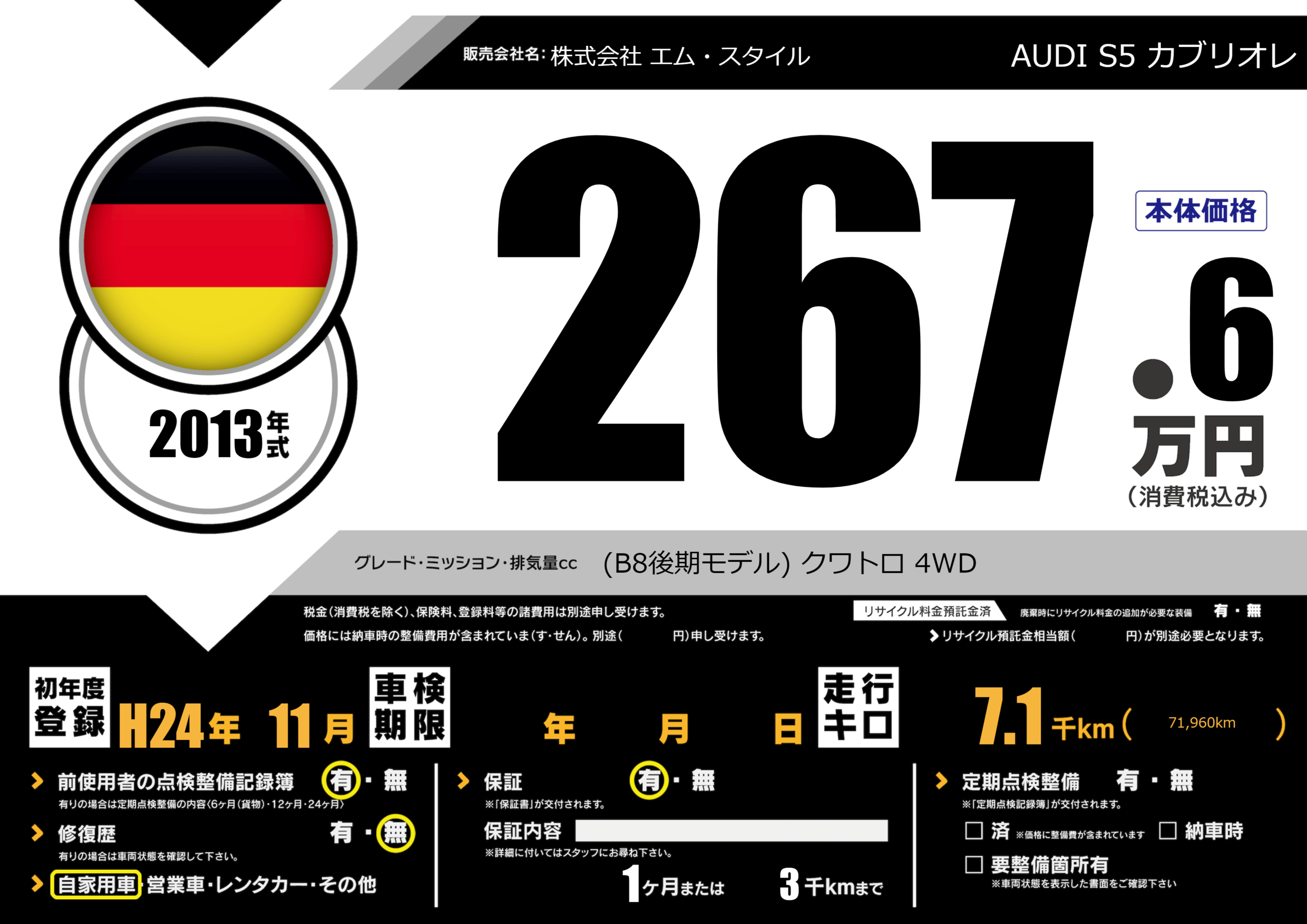 | 車名 | AUDI S5 カブリオレ | グレード ミッション 排気量 |
