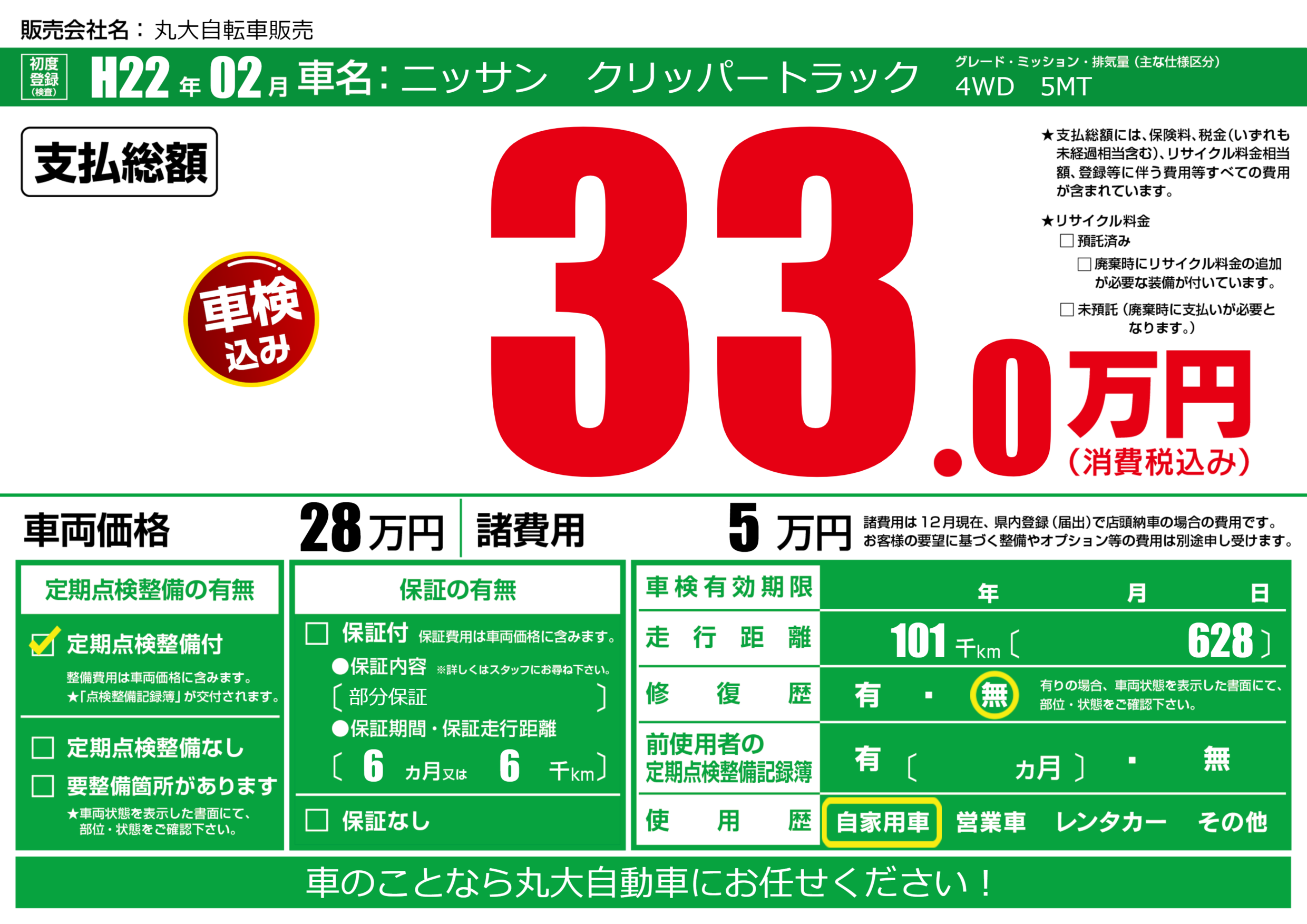 | 車名 | ニッサン クリッパートラック | グレード ミッション 排気量 |