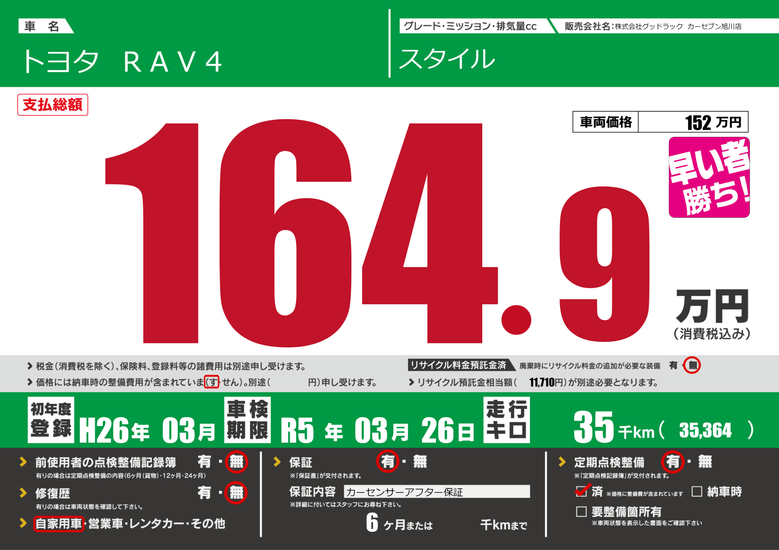 | 定期点検整備 | 定期点検整備あり 定期点検整備済み | ||