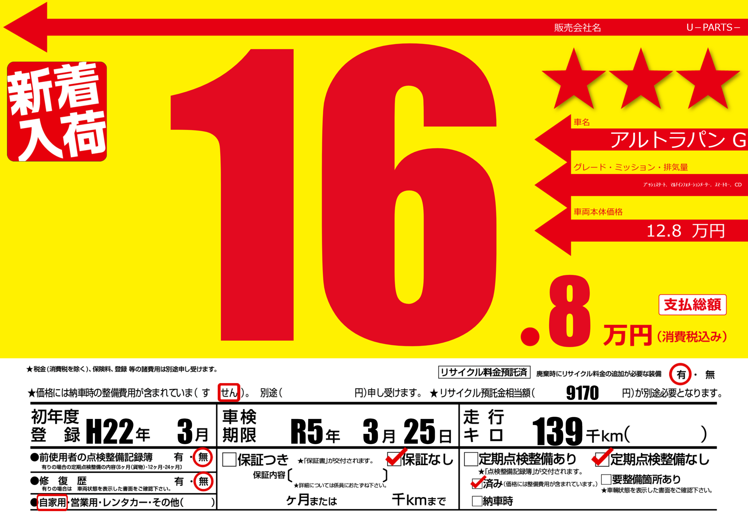 | 走行キロ | 13.9万km | 初年度登録 | H22年3月 |
