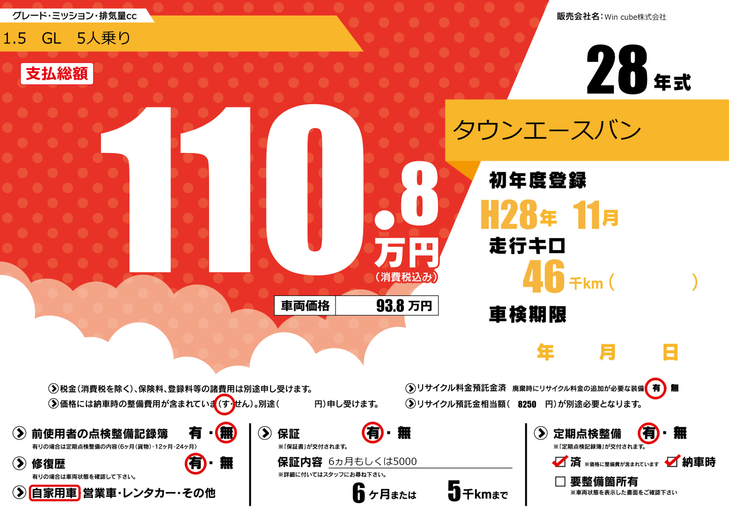 | 車名 | タウンエースバン | グレード ミッション 排気量 |