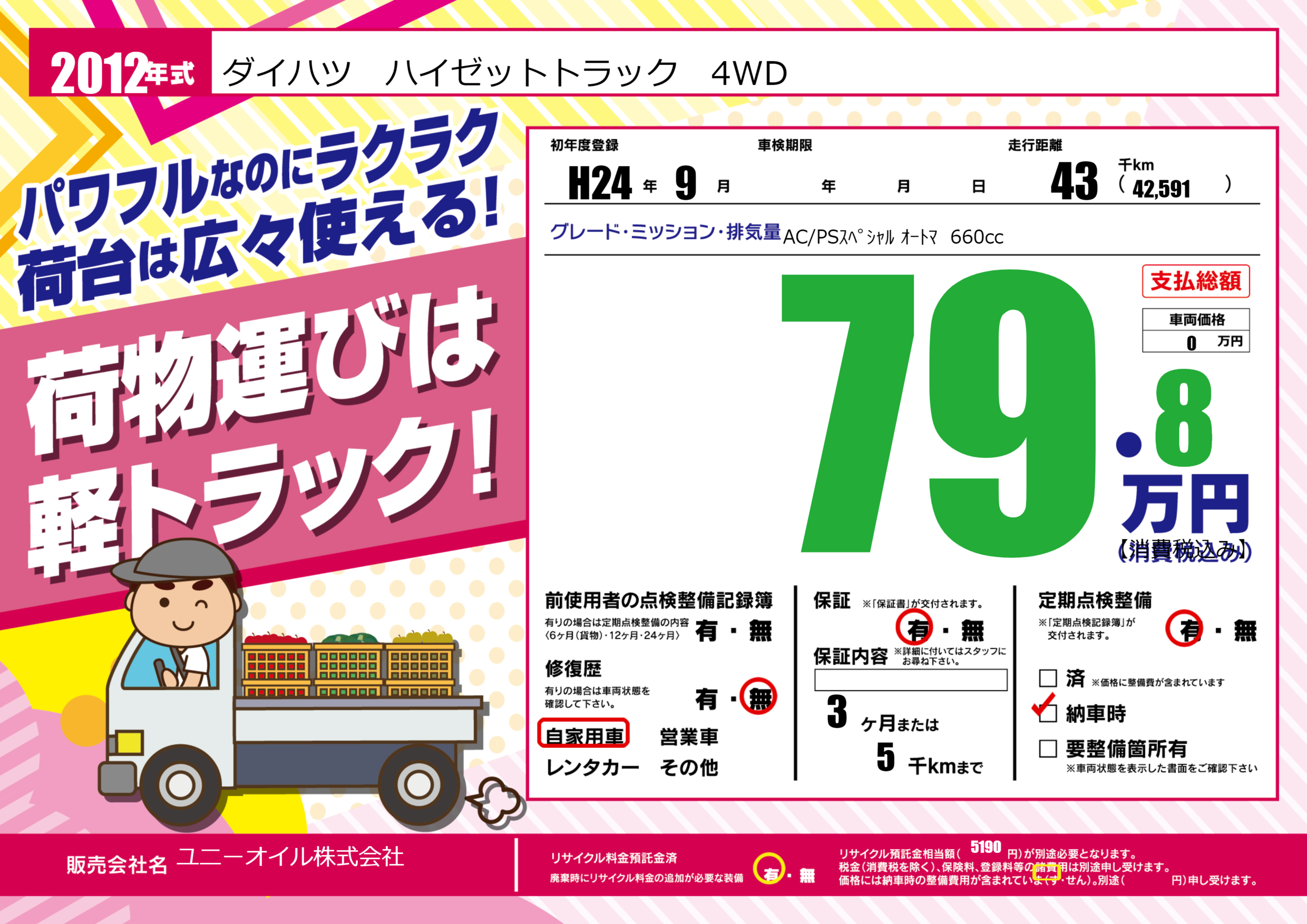 | 車名 | ダイハツ ハイゼットトラック 4WD | グレード ミッション 排気量 |