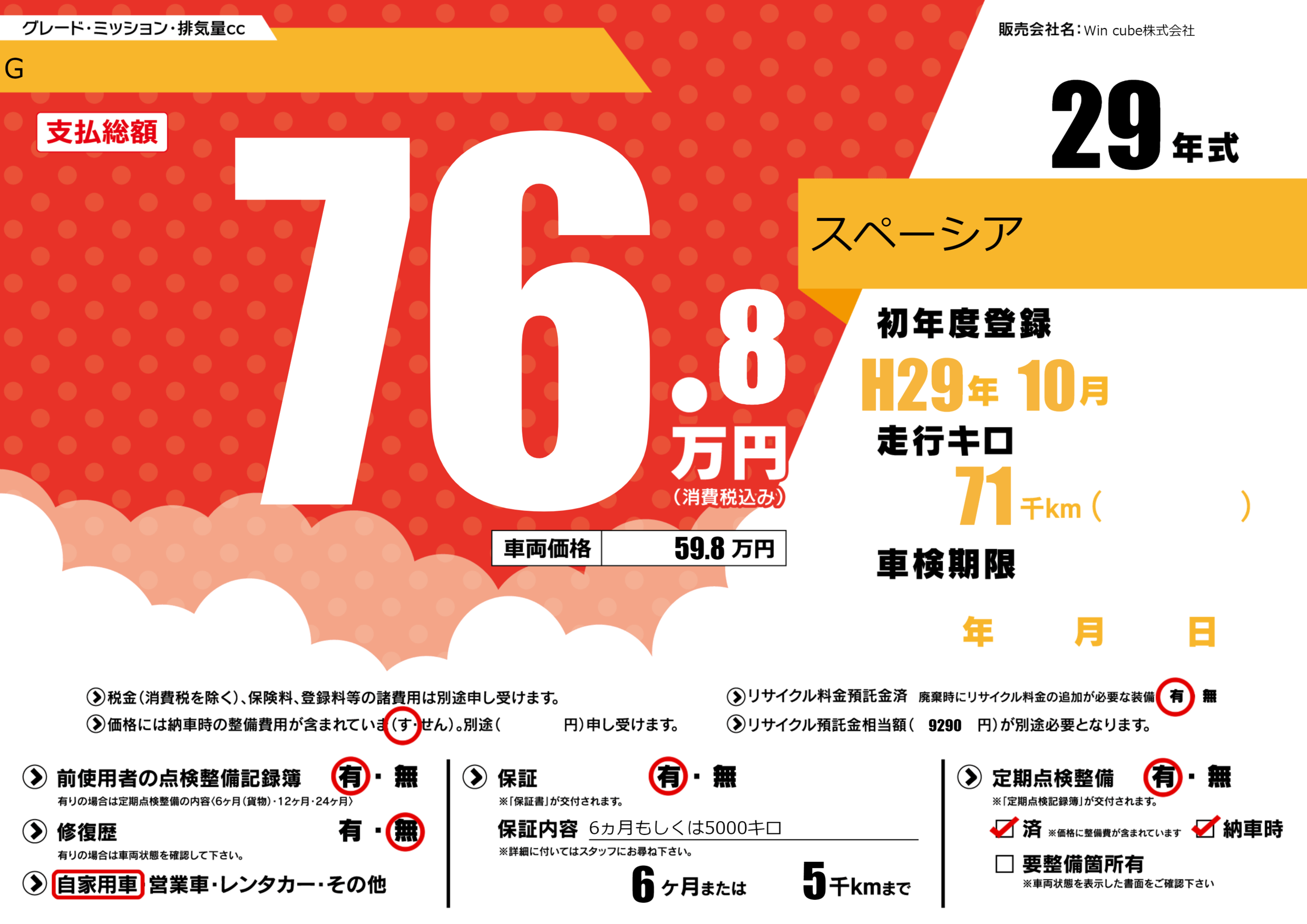 | 車名 | スペーシア | グレード ミッション 排気量 |