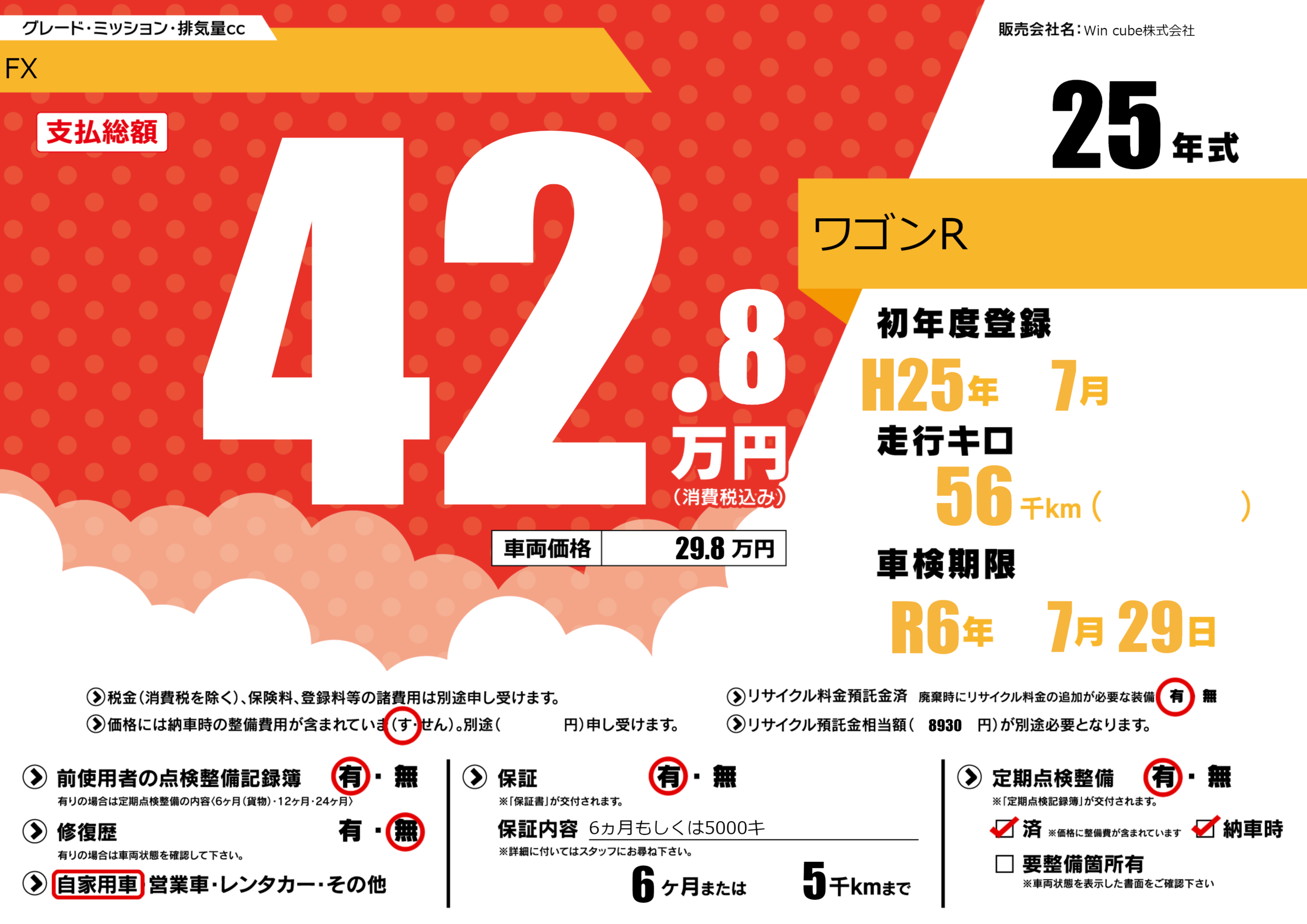 | 車名 | ワゴンR | グレード ミッション 排気量 |