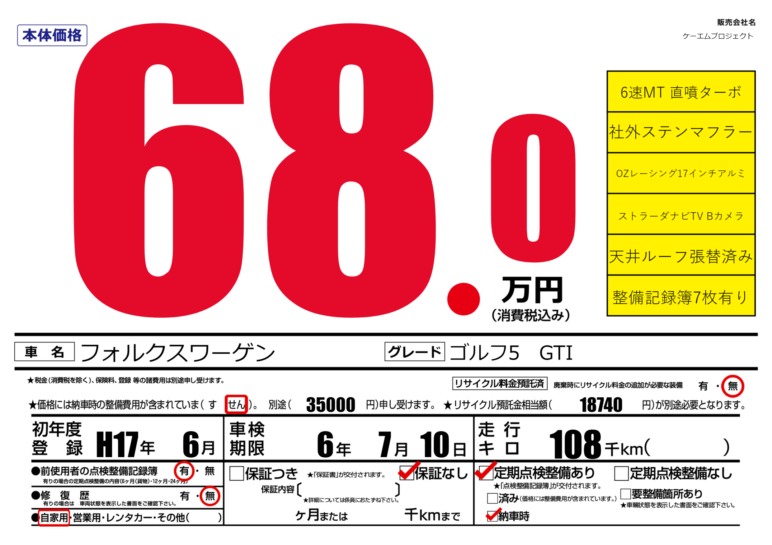 | 走行キロ | 10.8万km | 初年度登録 | H17年6月 |