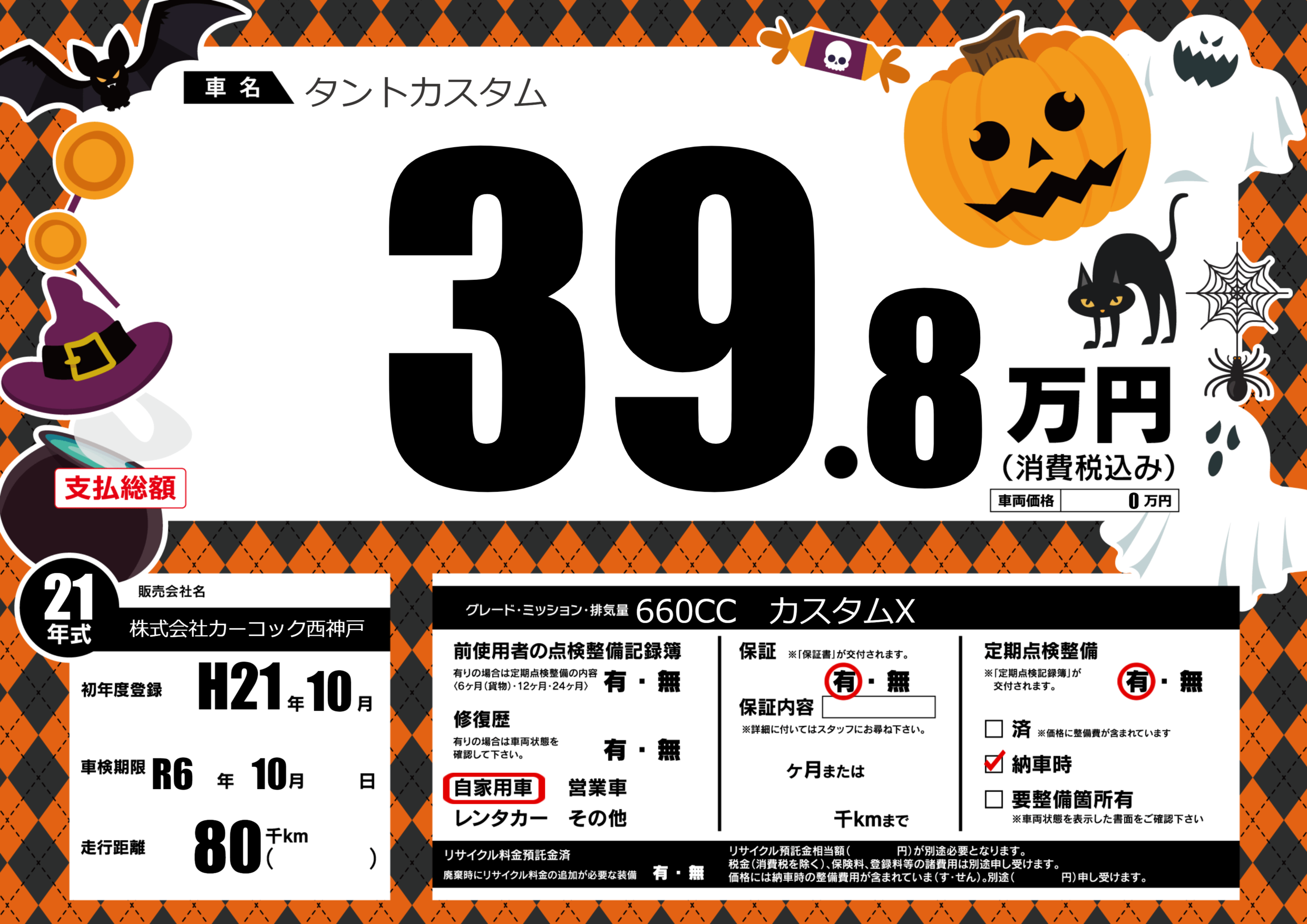 | 走行キロ | 8万km | 初年度登録 | H21年10月 |