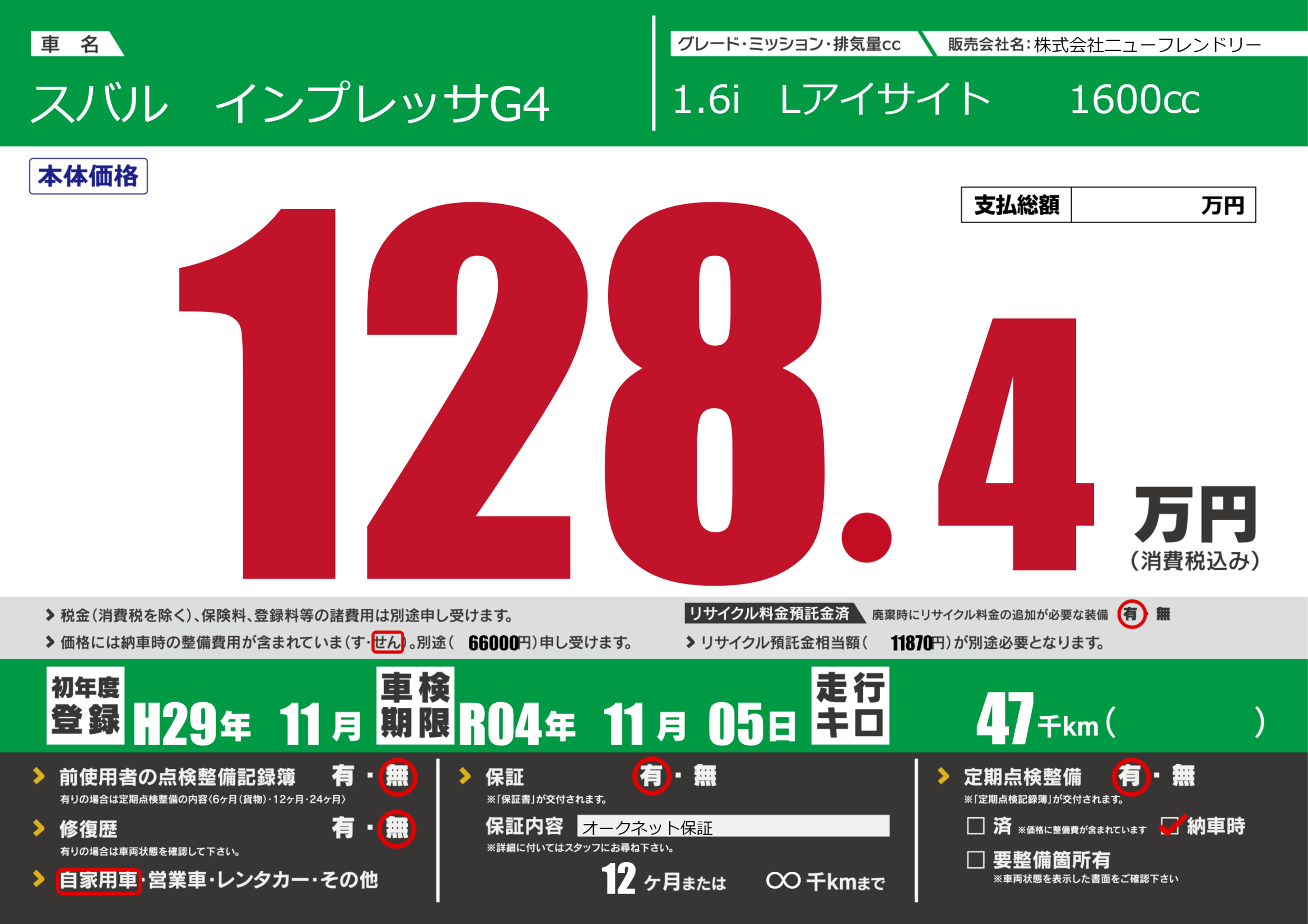 | 車名 | スバル インプレッサG4 | グレード ミッション 排気量 |