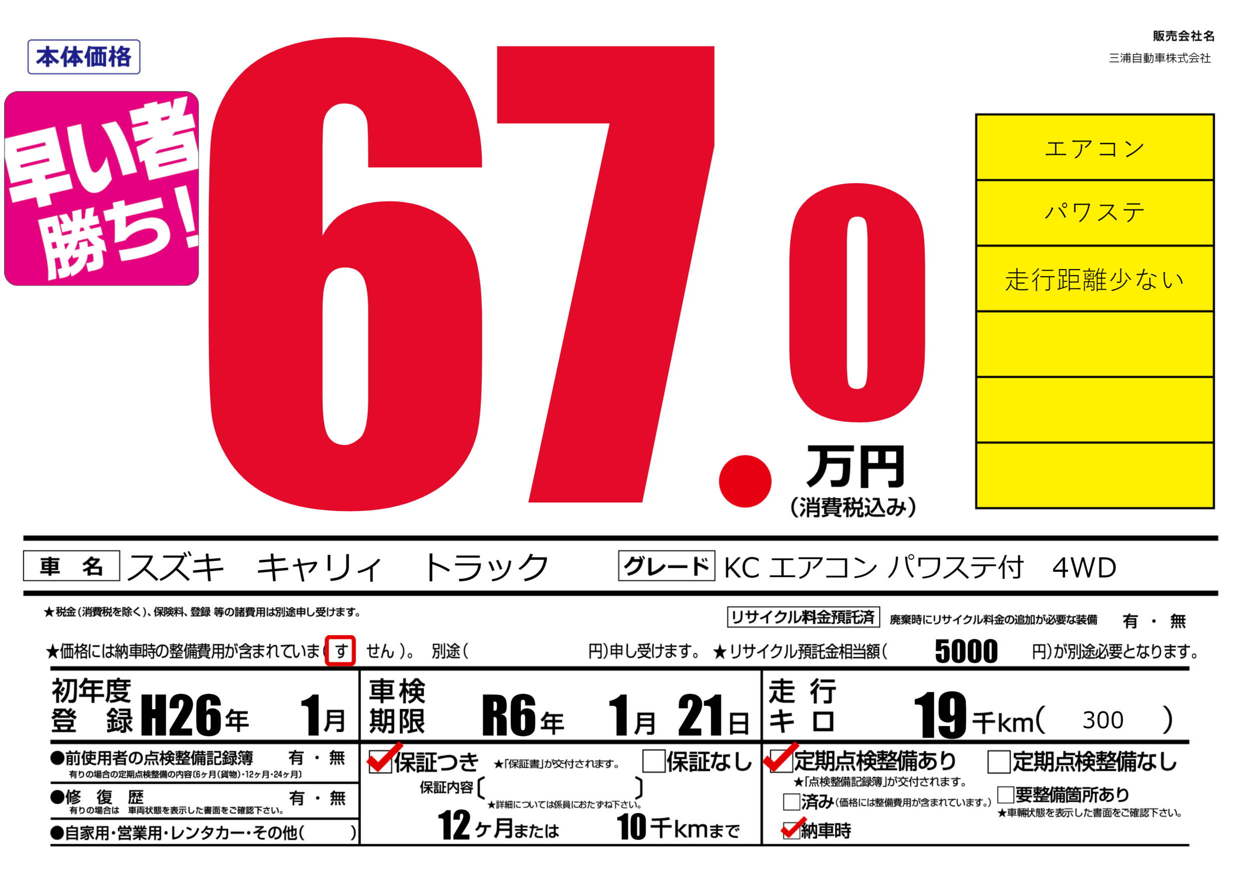 保証付き 保証内容(---) 12ヶ月または(10)千kmまで |