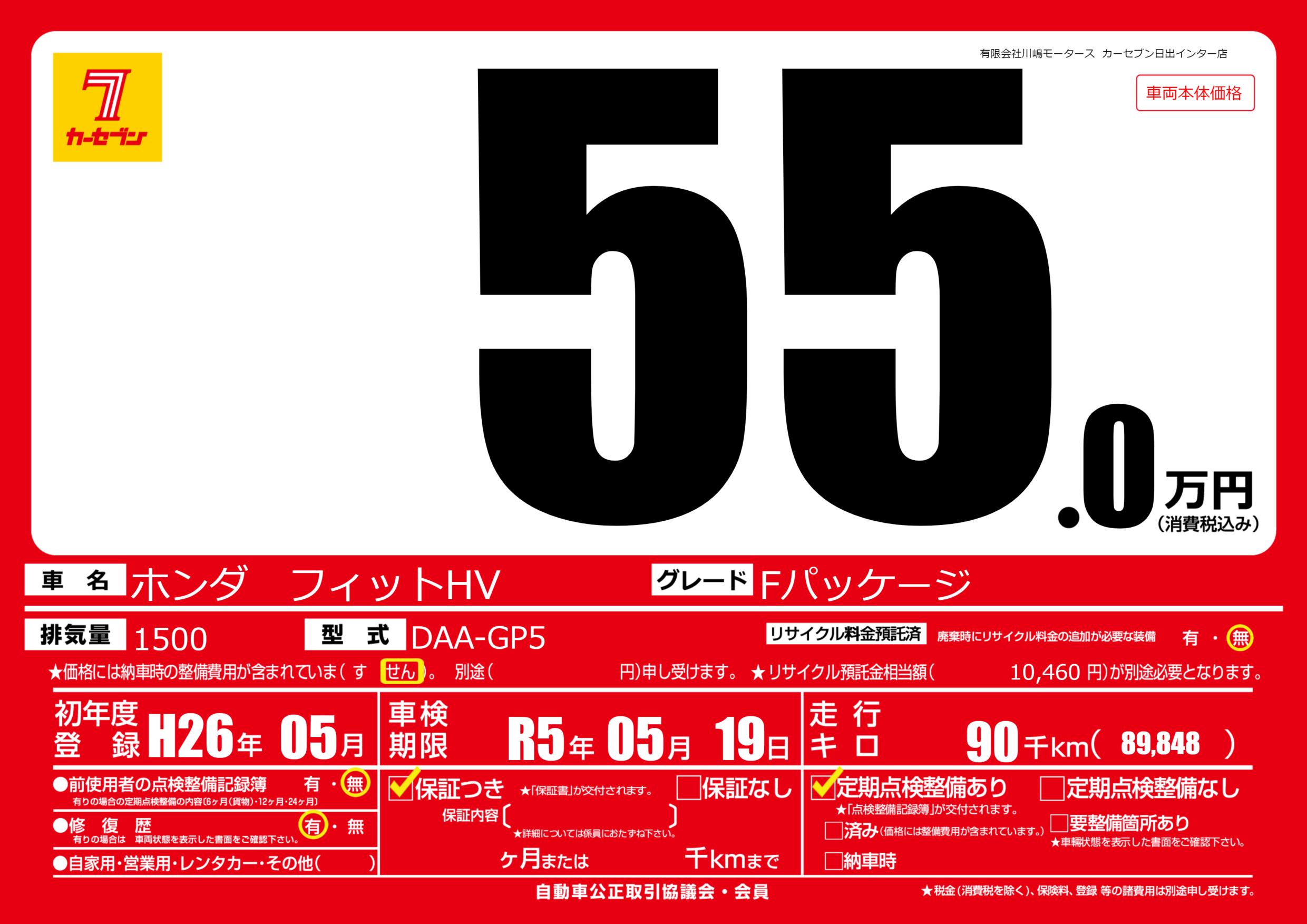 | 車名 | ホンダ フィットHV | グレード ミッション 排気量 |