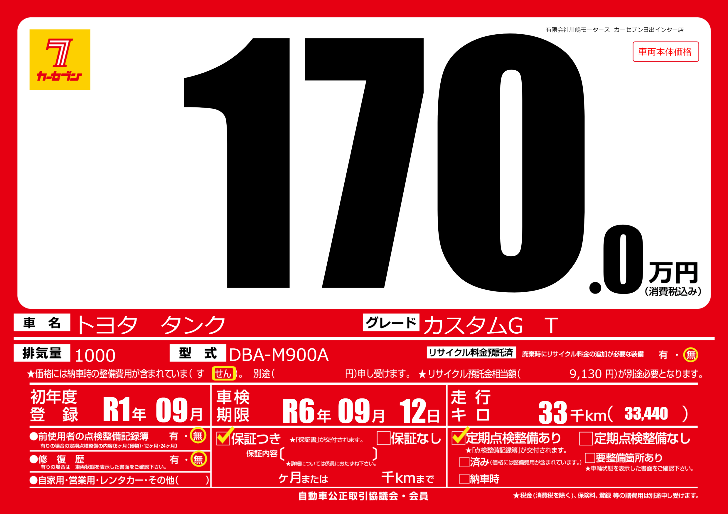 | 車名 | トヨタ タンク | グレード ミッション 排気量 |