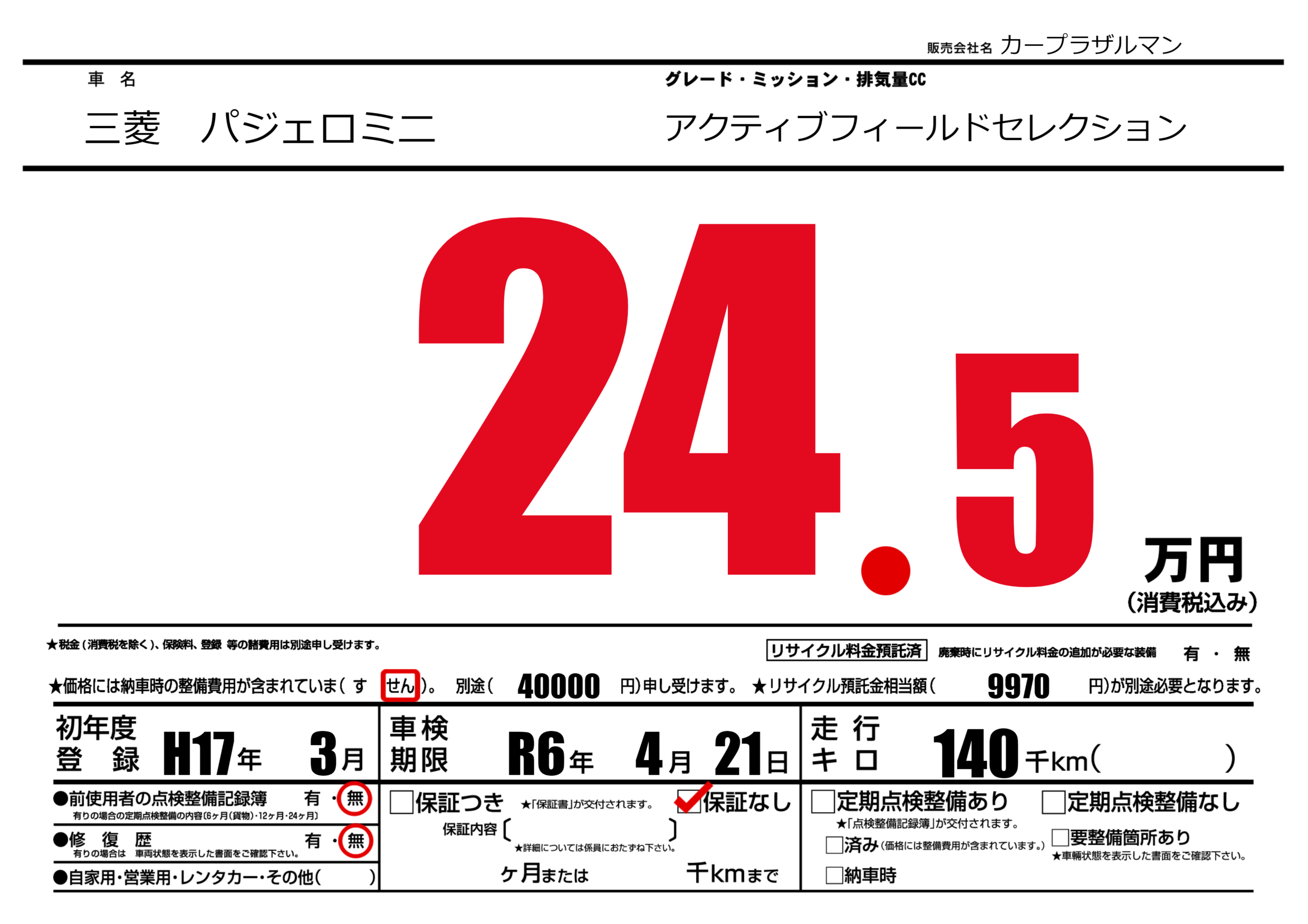 | 車名 | 三菱 パジェロミニ | グレード ミッション 排気量 |