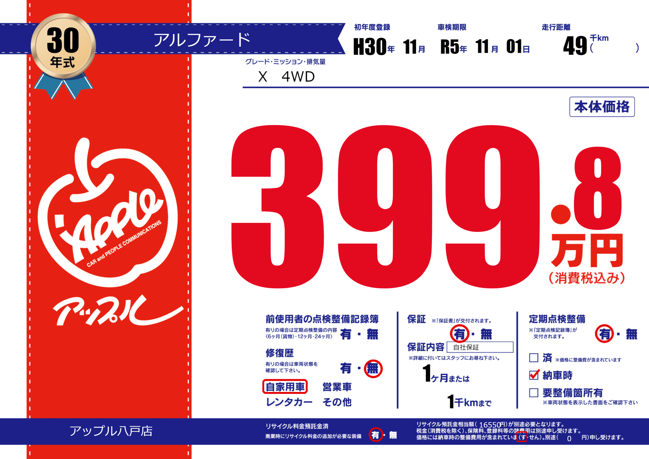 保証付き 保証内容( 自社保証) 1ヶ月または(1)千kmまで |