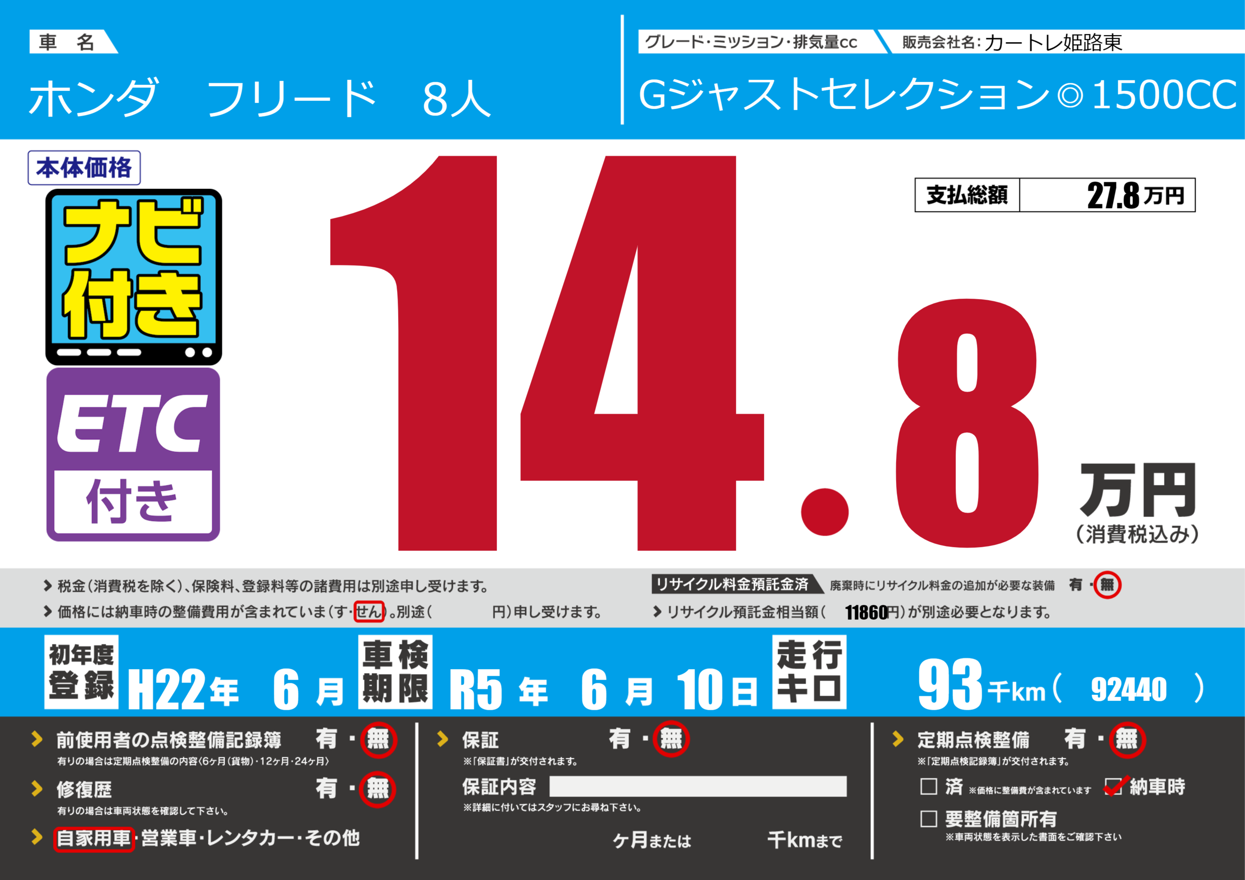 定期点検整備 | 定期点検整備なし 納車時あり |