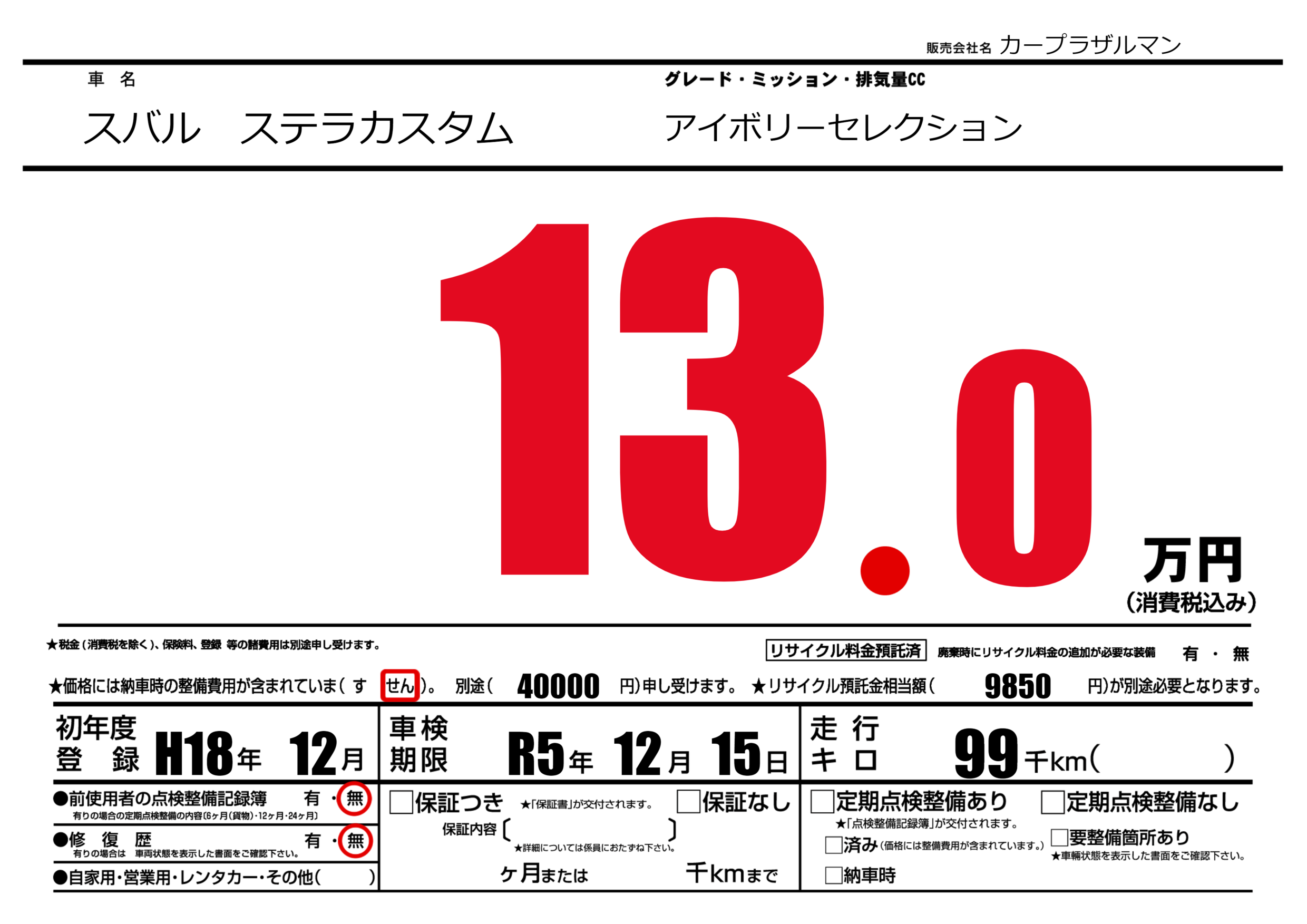 | 車名 | スバル ステラカスタム | グレード ミッション 排気量 |