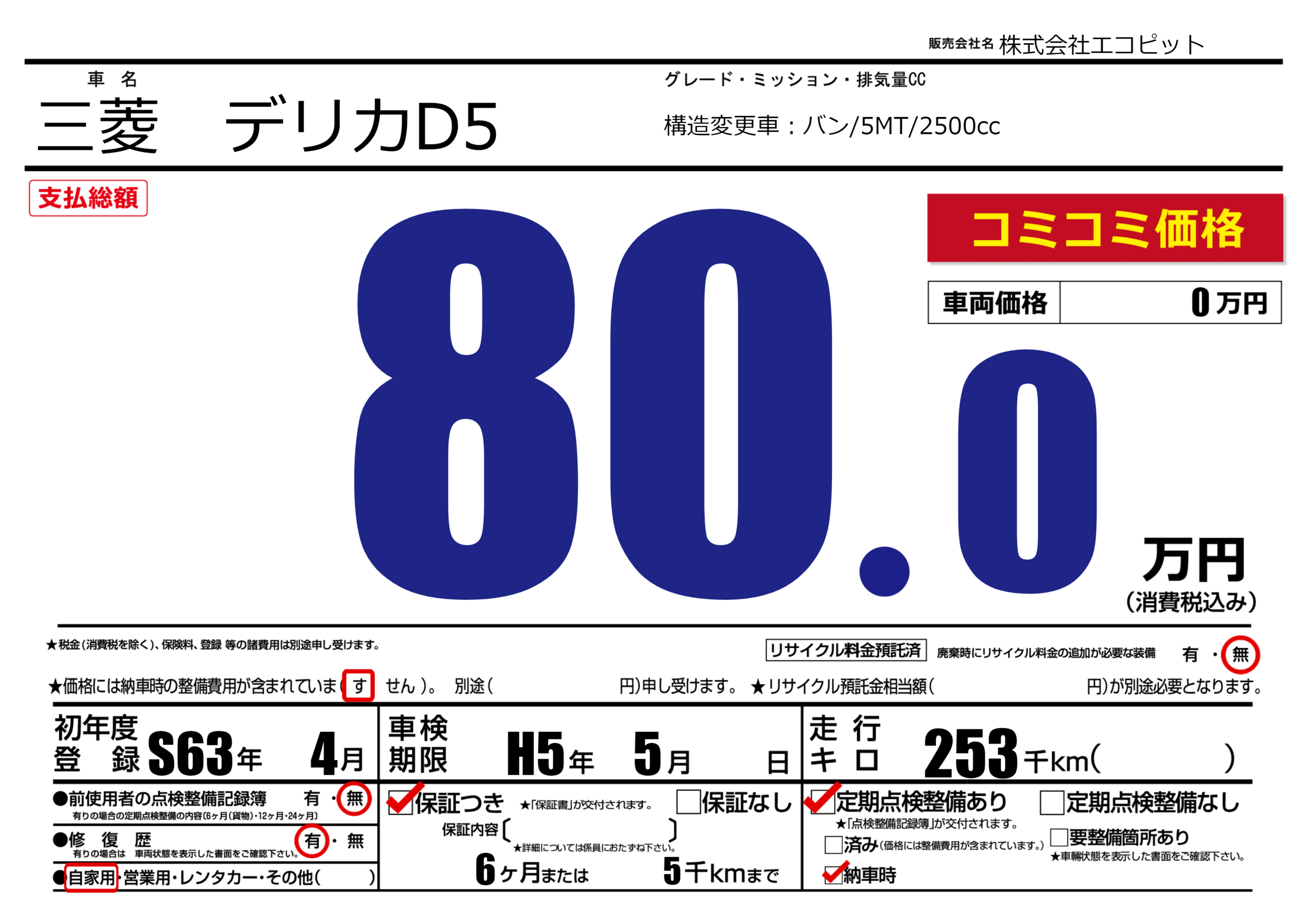 あり | 車検制限 | H5年5月---月 |