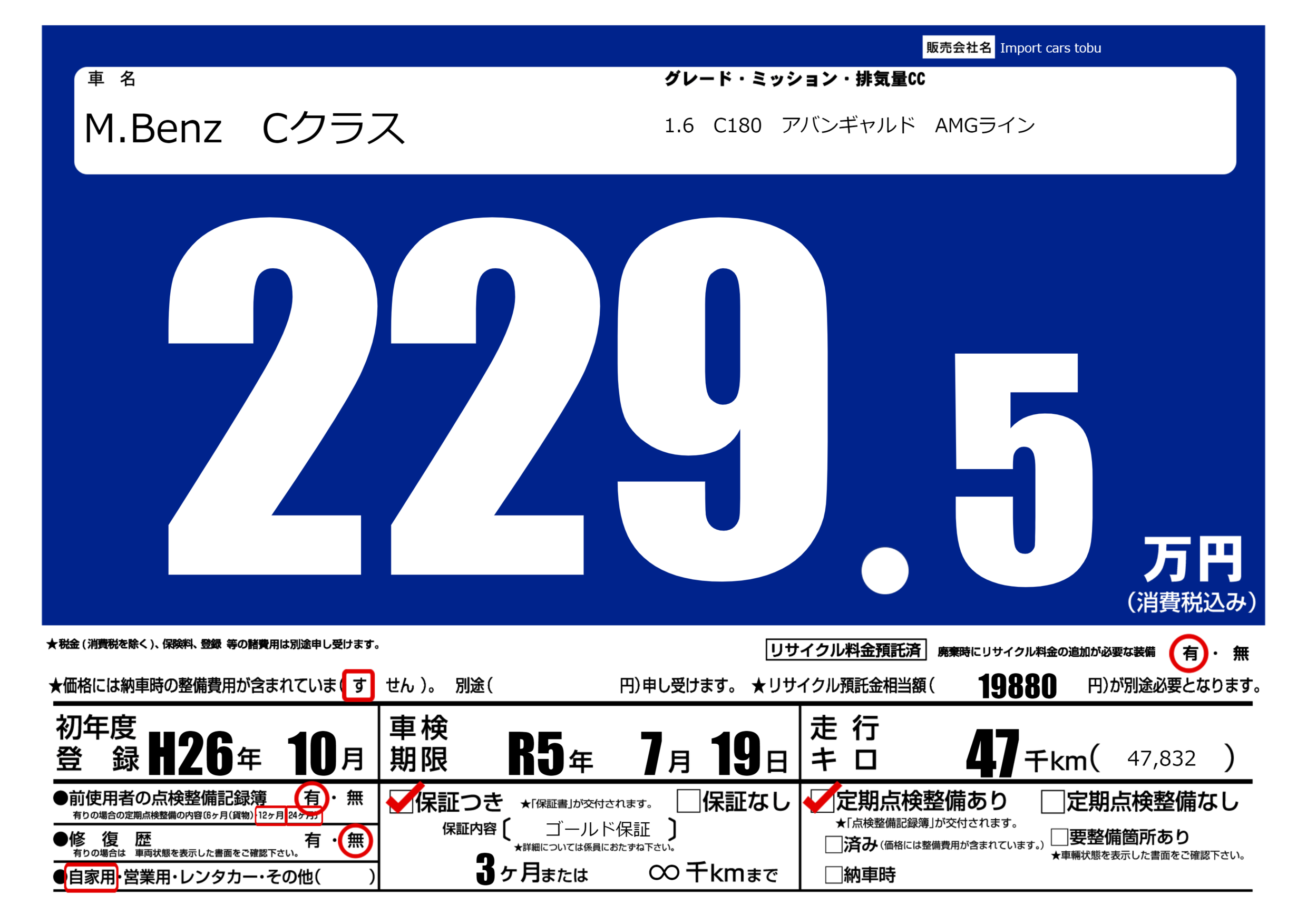 | 車名 | M.Benz Cクラス | グレード ミッション 排気量 |