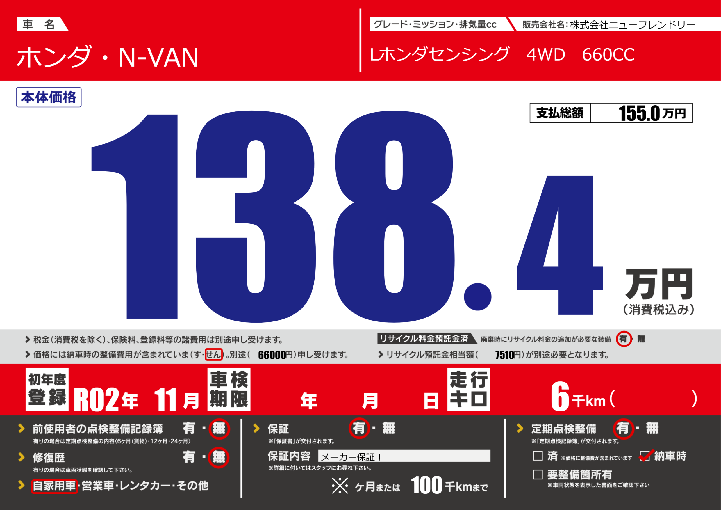 | 車名 | ホンダ・N-VAN | グレード ミッション 排気量 |