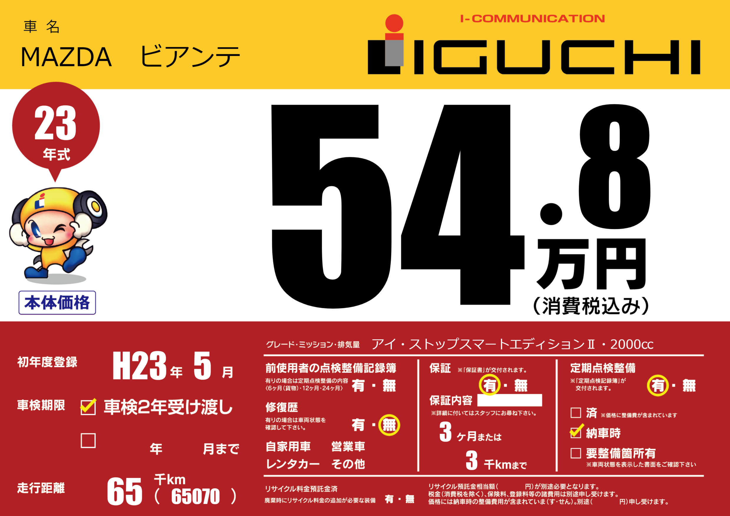 | 車名 | MAZDA ビアンテ | グレード ミッション 排気量 |