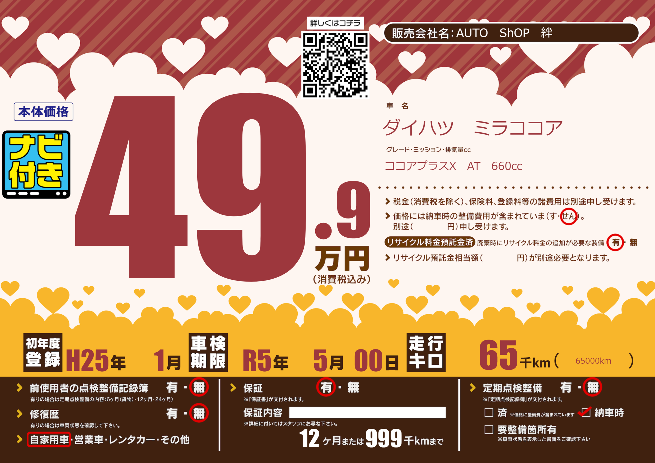 | 車名 | ダイハツ ミラココア | グレード ミッション 排気量 |