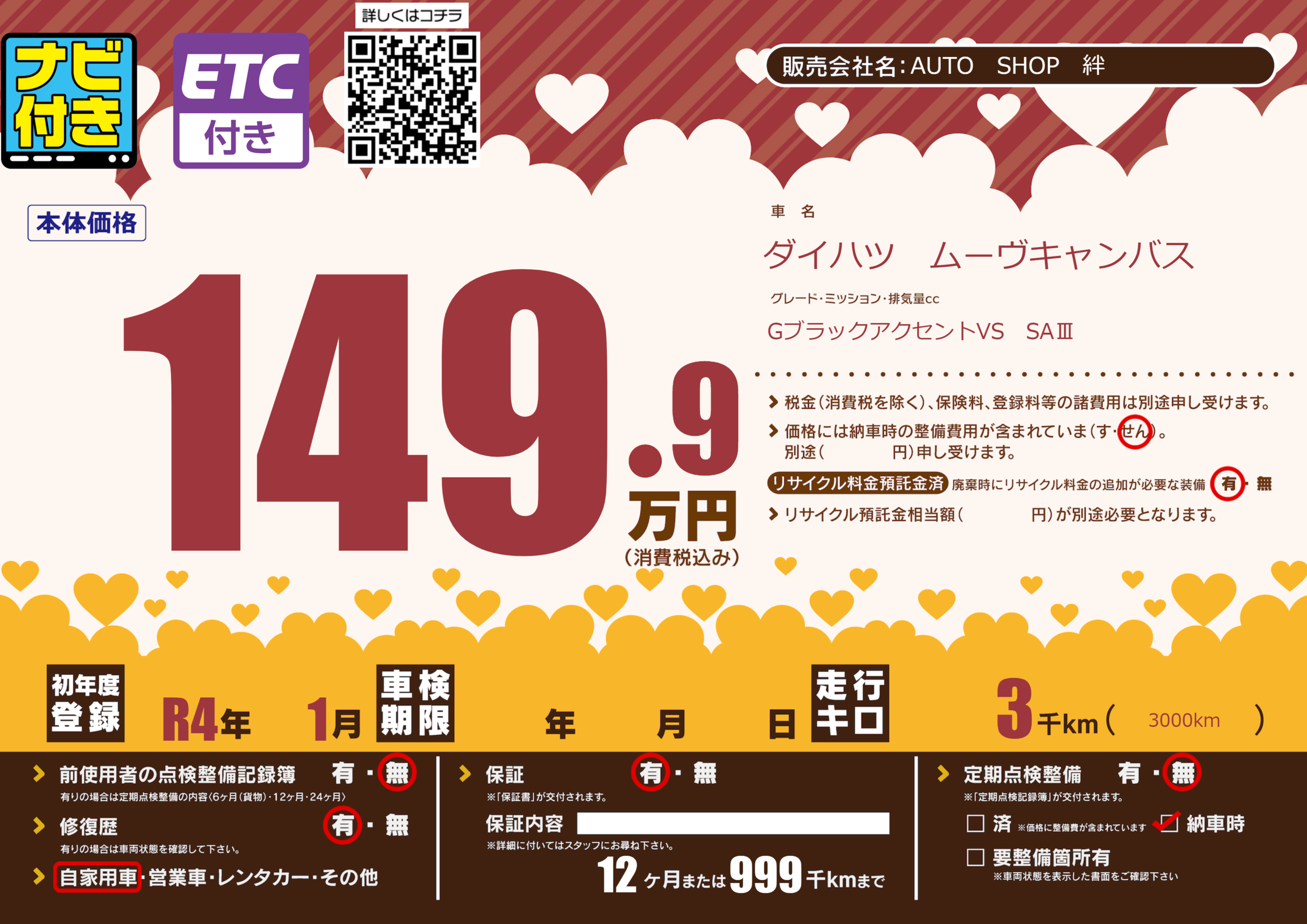| 車名 | ダイハツ ムーヴキャンバス | グレード ミッション 排気量 |