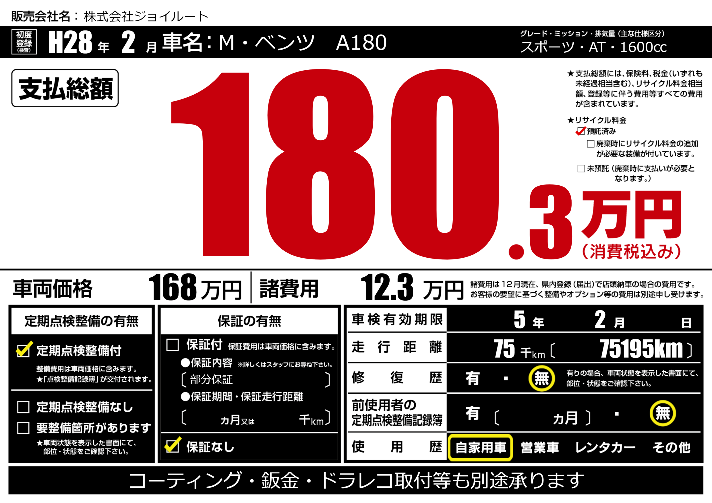 | 車名 | M・ベンツ A180 | グレード ミッション 排気量 |