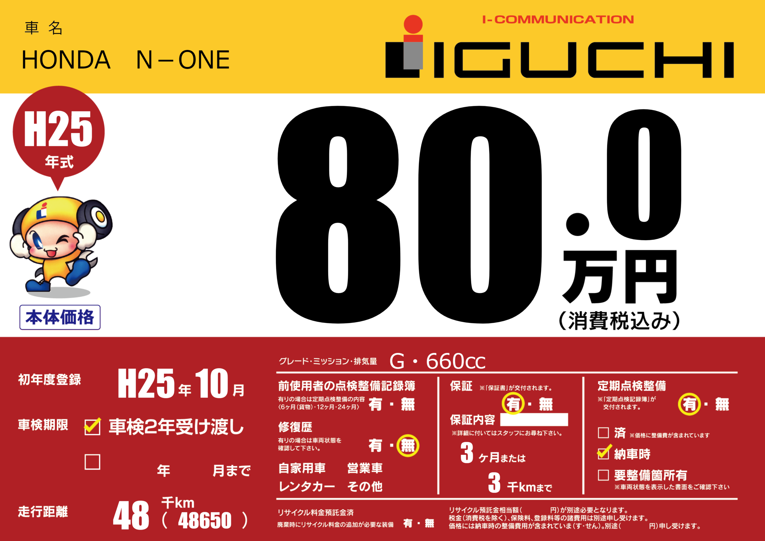 | 車名 | HONDA N-ONE | グレード ミッション 排気量 |