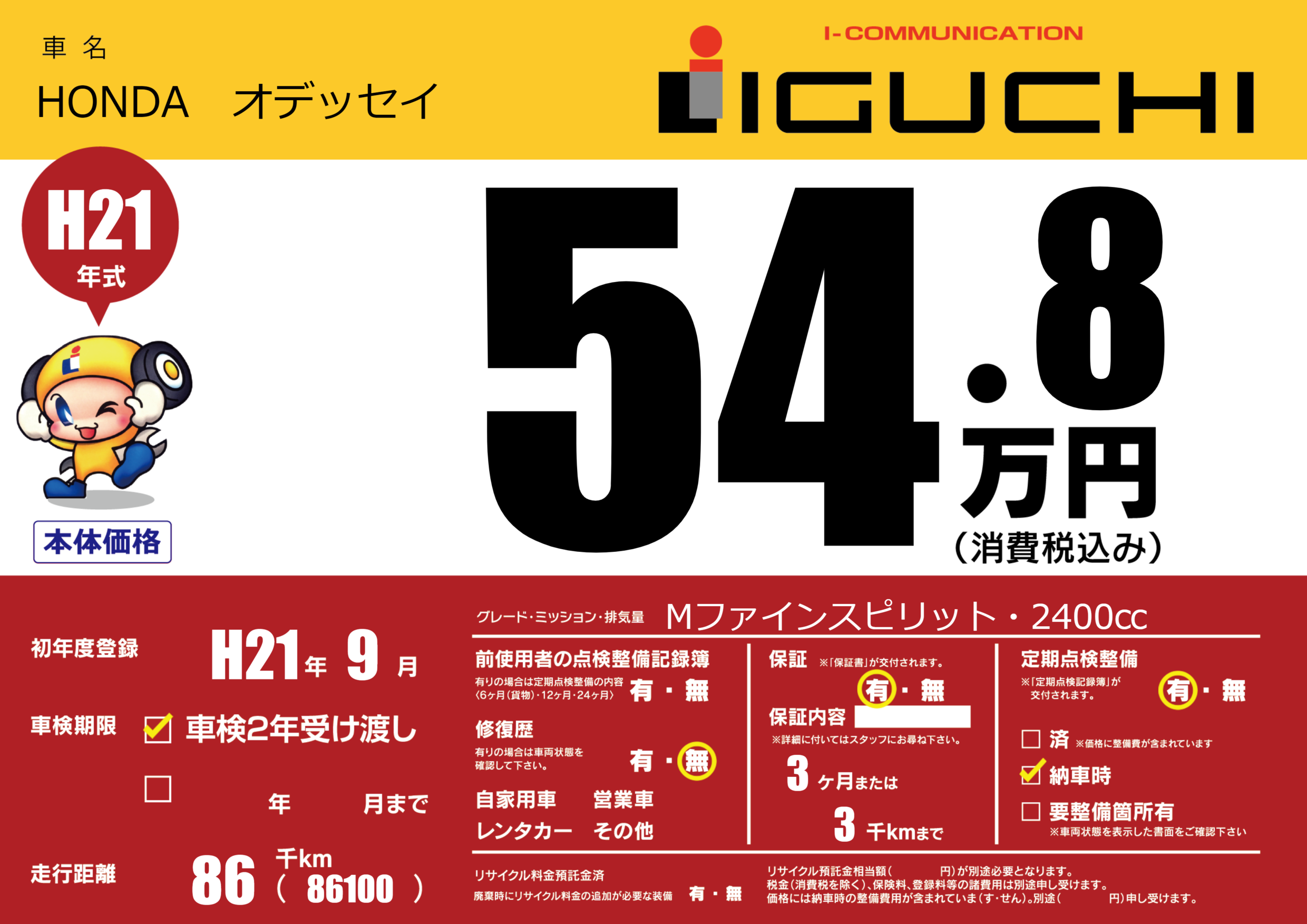 | 走行キロ | 8.6万km | 初年度登録 | H21年9月 |