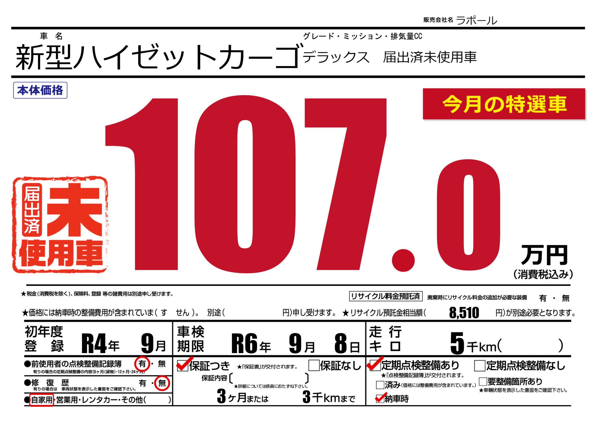 | 走行キロ | 0.5万km | 初年度登録 | R4年9月 |