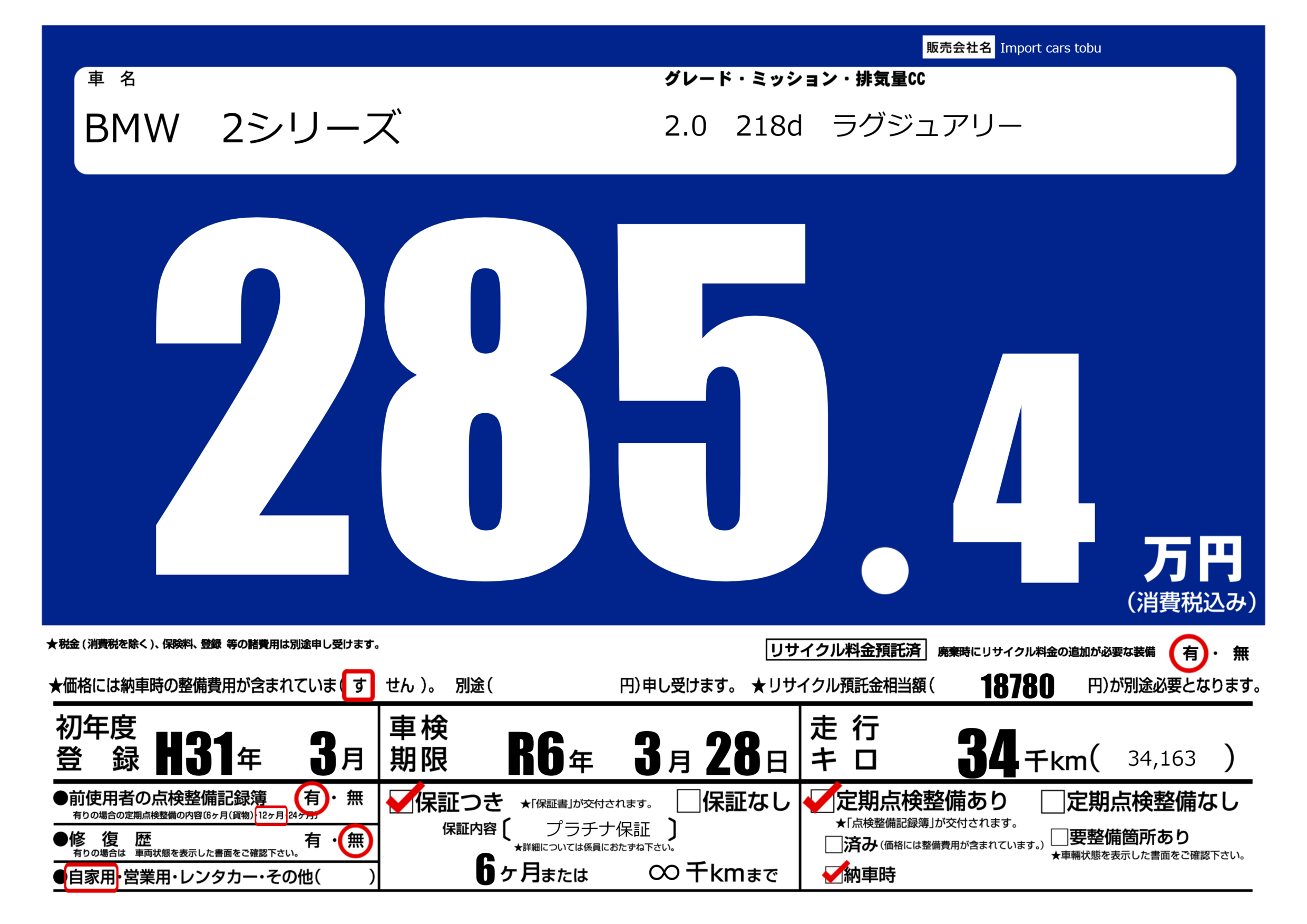 保証付き 保証内容( プラチナ保証) 6ヶ月または(∞)千kmまで |