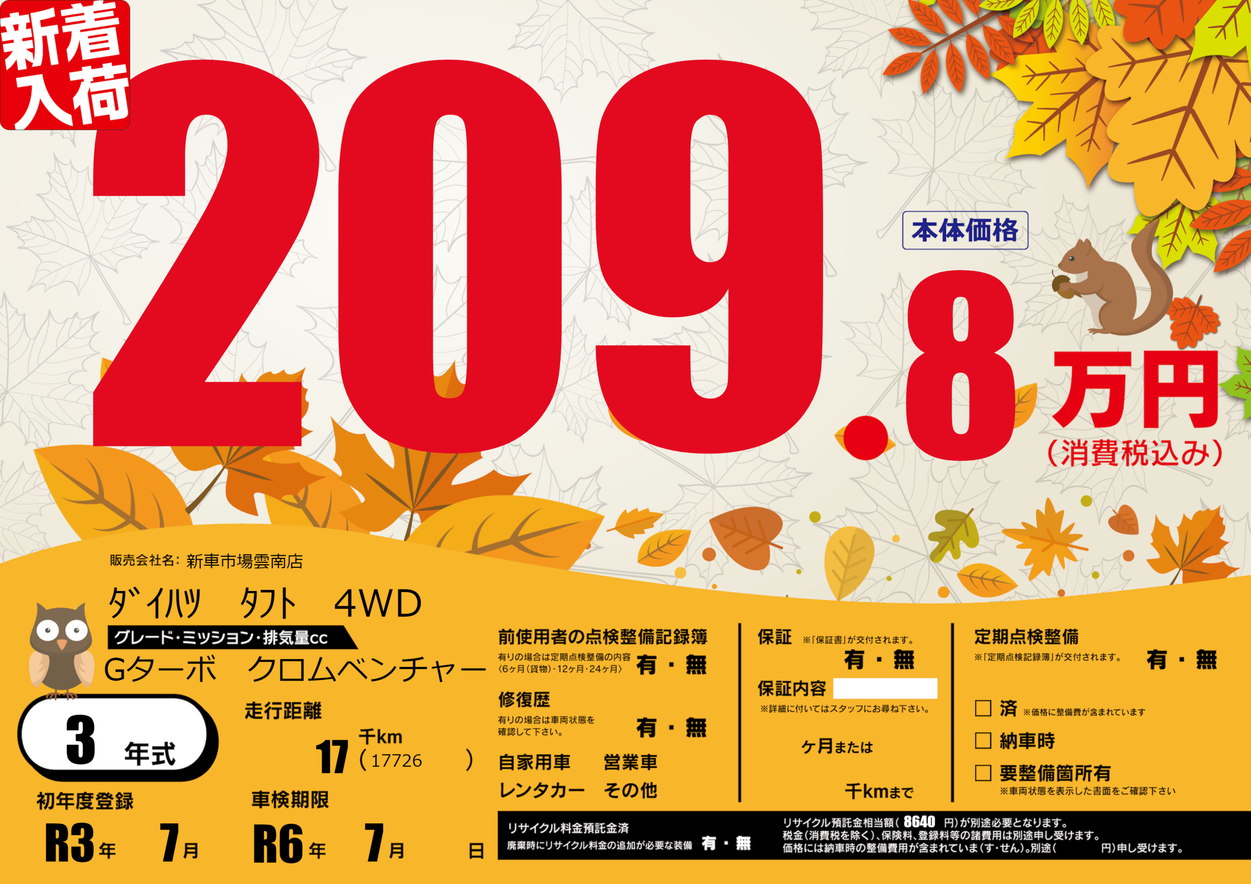 | 車名 | ダイハツ タフト 4WD | グレード ミッション 排気量 |