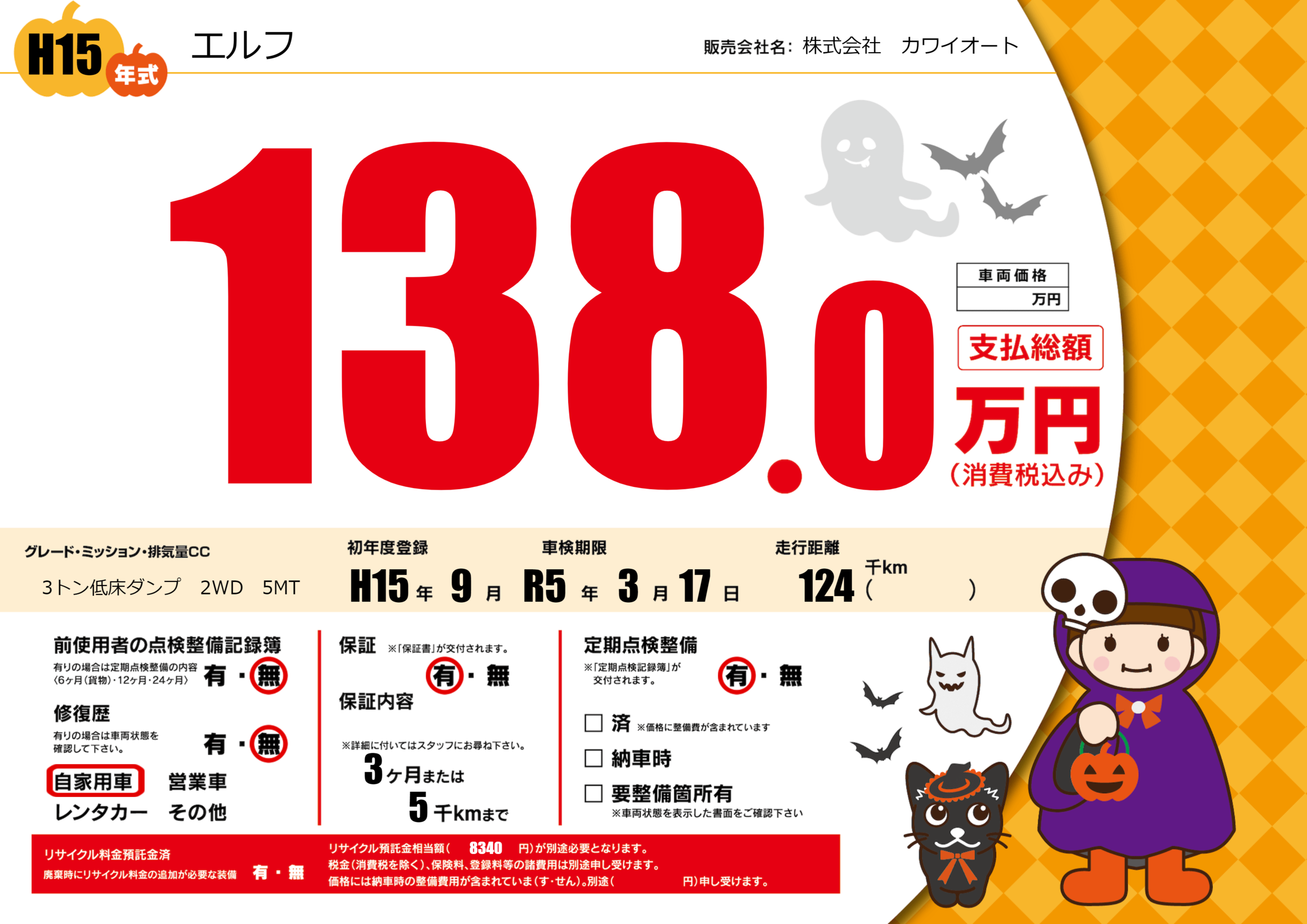 | 走行キロ | 12.4万km | 初年度登録 | H15年9月 |