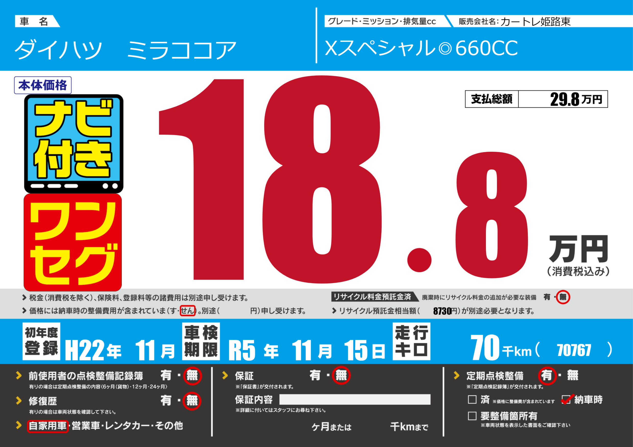 | 走行キロ | 7万km | 初年度登録 | H22年11月 |