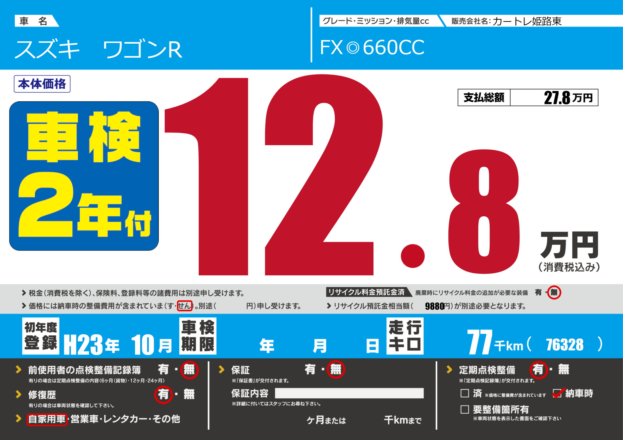 | 走行キロ | 7.7万km | 初年度登録 | H23年10月 |
