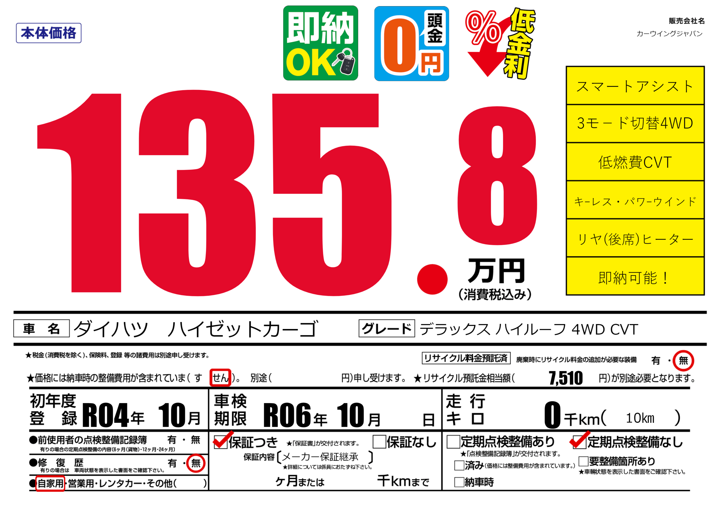 | 車名 | ダイハツ ハイゼットカーゴ | グレード ミッション 排気量 |