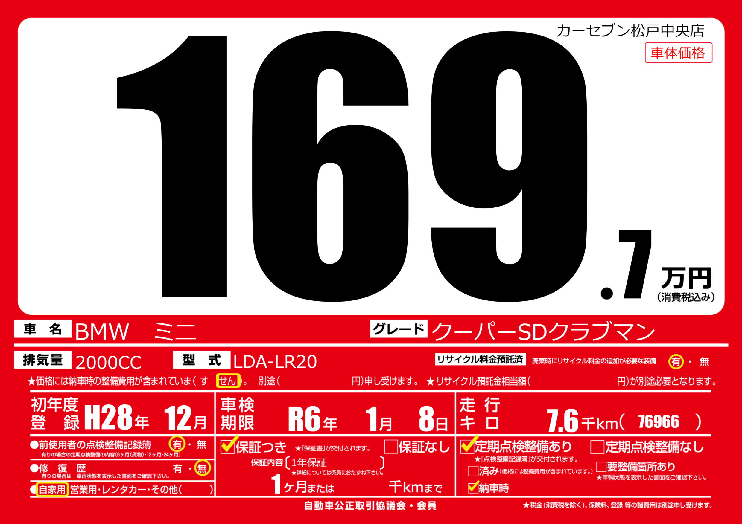 | 車名 | BMW ミニ | グレード ミッション 排気量 |