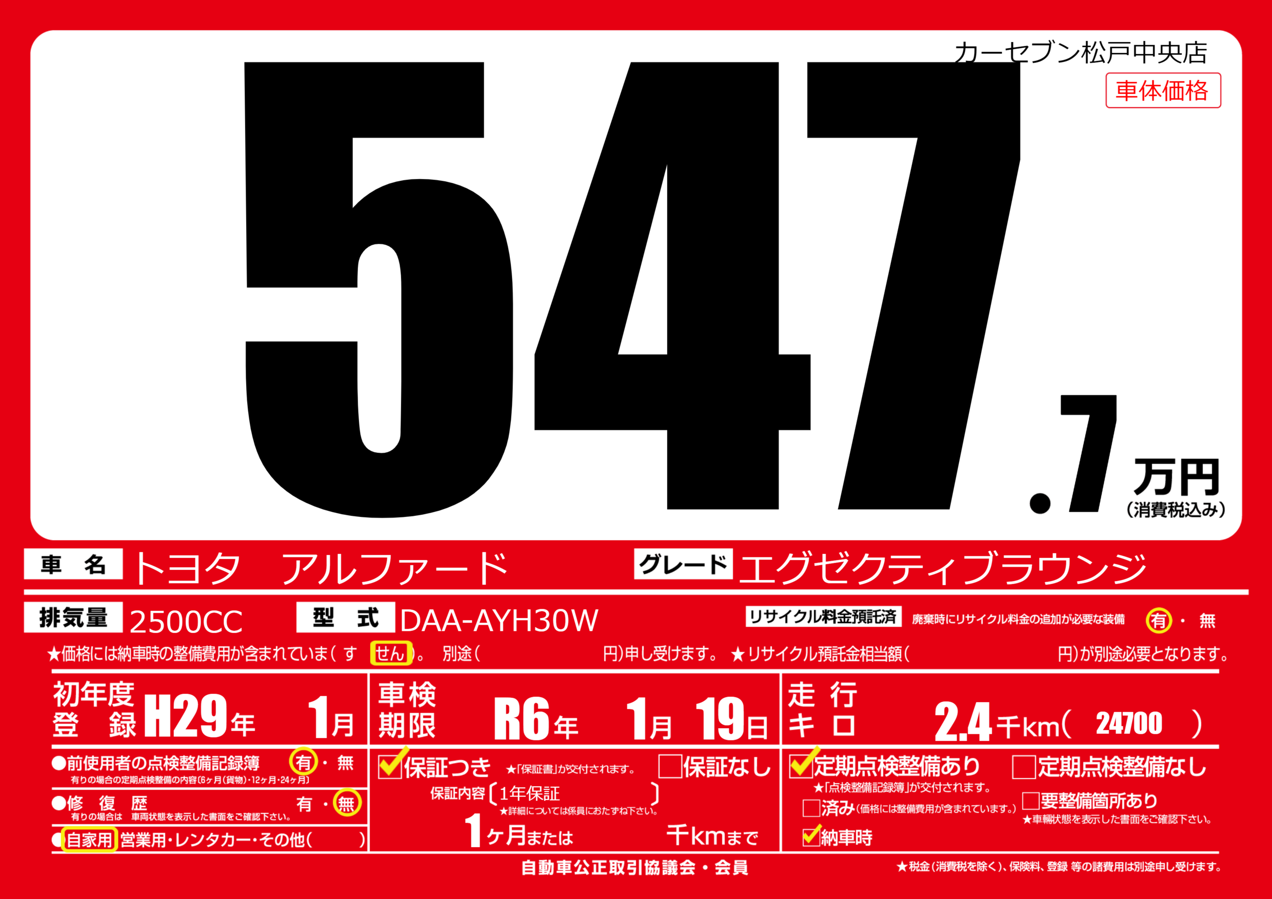 | 車名 | トヨタ アルファード | グレード ミッション 排気量 |
