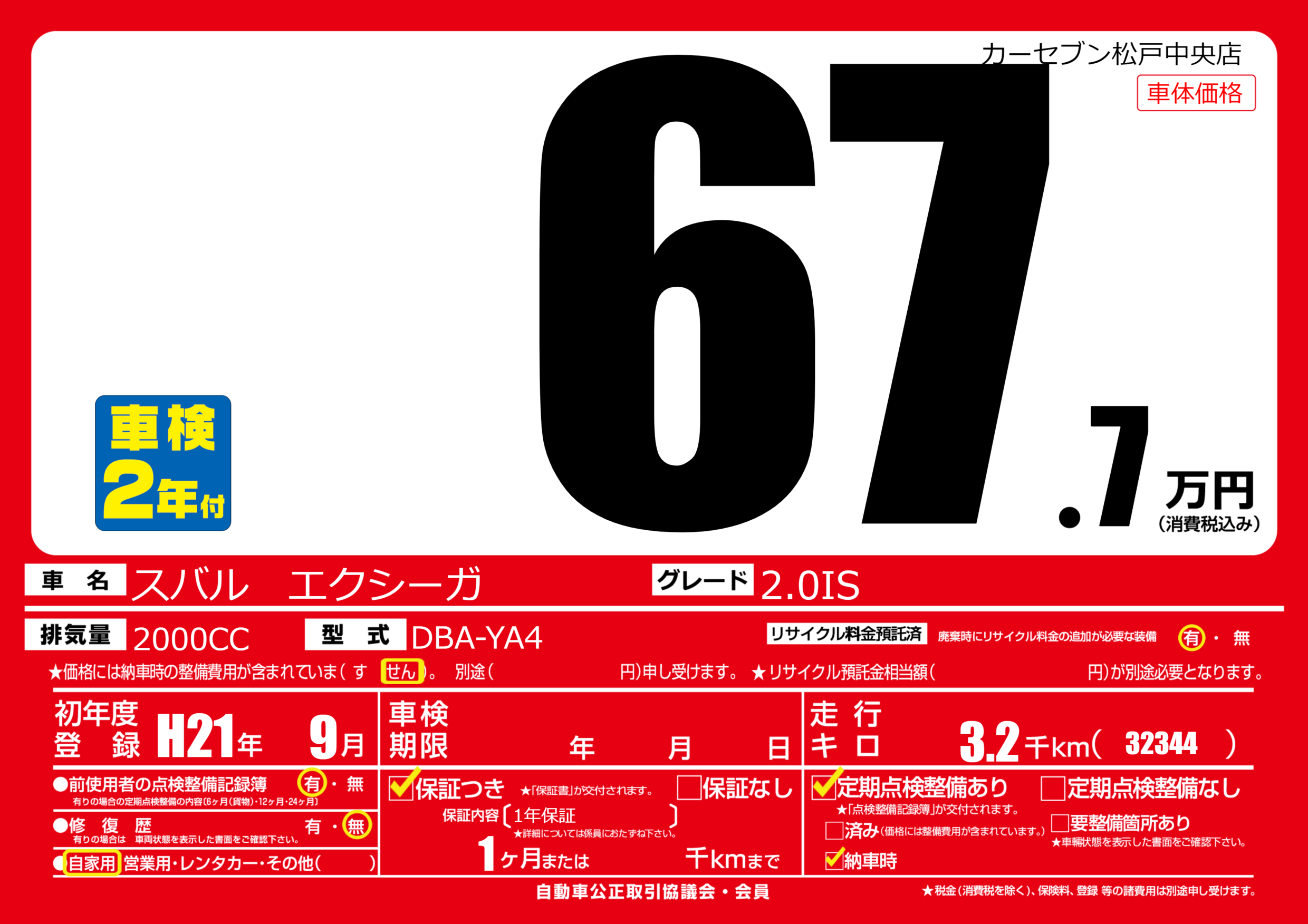 | 車名 | スバル エクシーガ | グレード ミッション 排気量 |